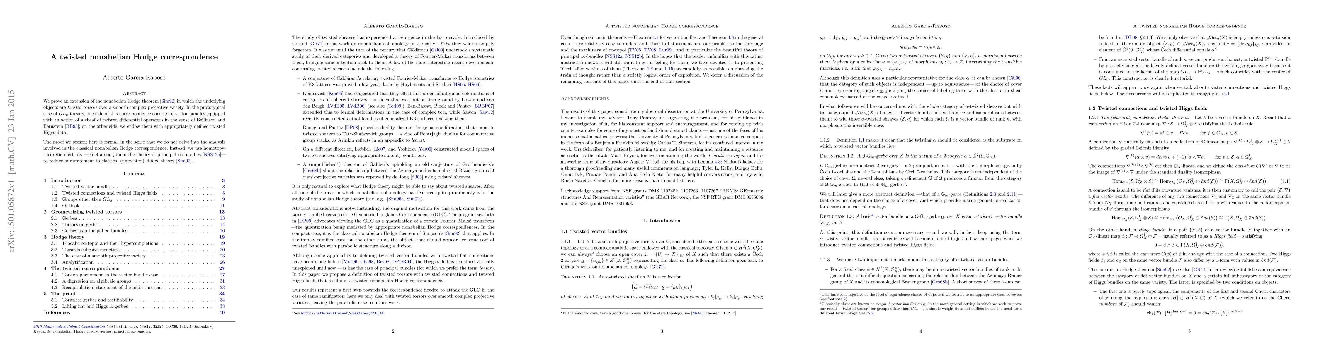The paper extends the nonabelian Hodge theorem to twisted torsors over a smooth projective variety, establishing a correspondence between vector bundles with twisted differential operators and those with twisted Higgs data. The proof leverages homotopy-theoretic methods, particularly principal $\infty$-bundles, to relate this to classical untwisted Hodge theory.