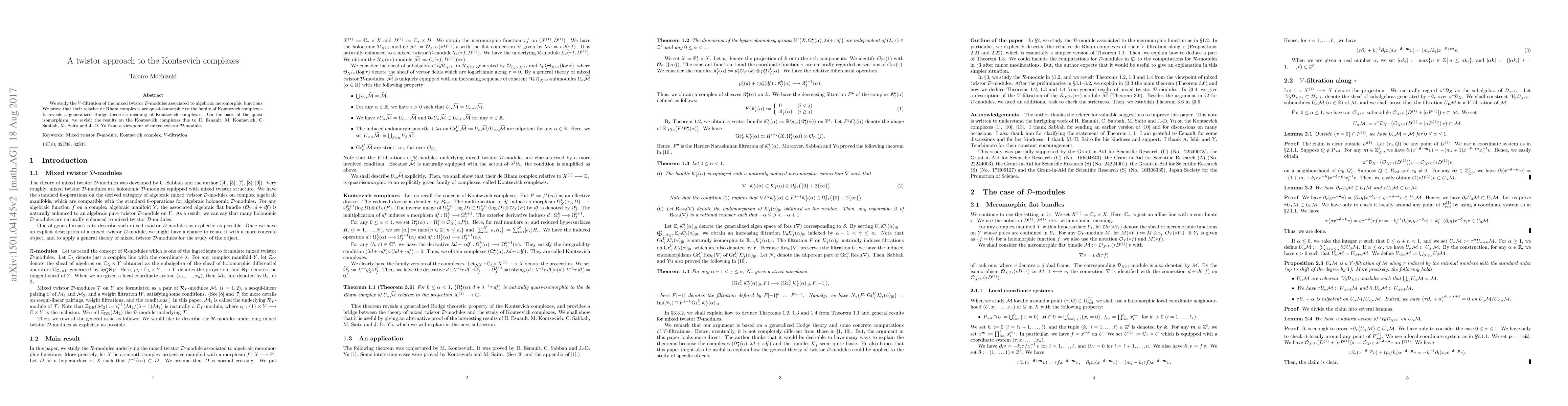 This paper revisits findings on Kontsevich complexes using mixed twistor D-modules, detailing the V-filtration and its relation to relative de Rham complexes, ultimately linking these results to the original findings by Esnault, Sabbah, Saito, and Yu.