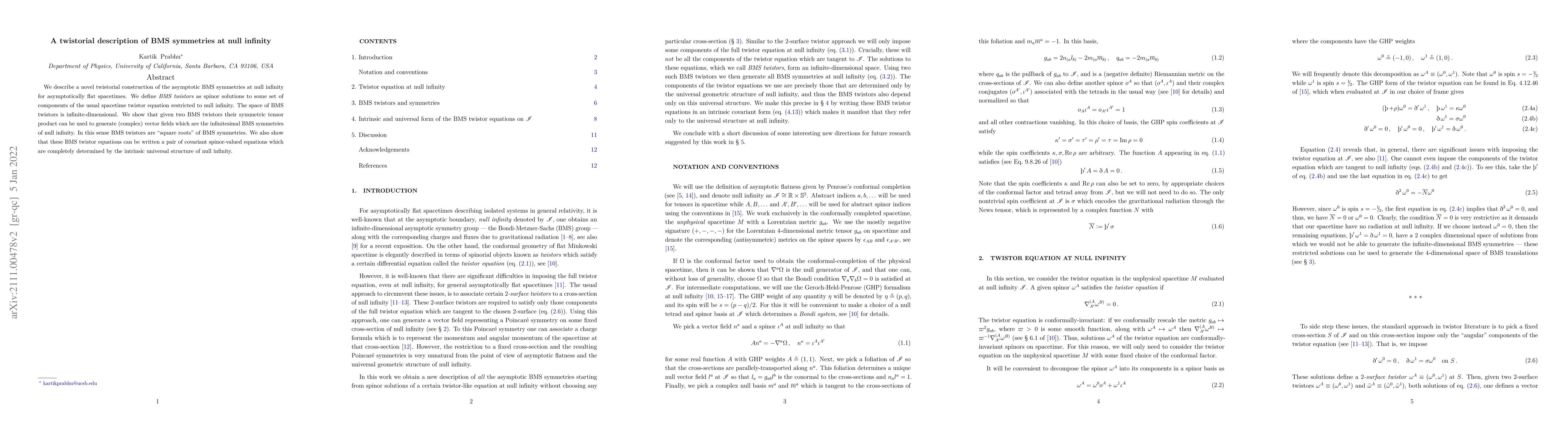 This paper presents a twistorial framework for understanding BMS symmetries at null infinity in asymptotically flat spacetimes, defining BMS twistors as spinor solutions to specific twistor equations. It demonstrates that the symmetric tensor product of BMS twistors generates the infinitesimal BMS symmetries, establishing BMS twistors as "square roots" of BMS symmetries.