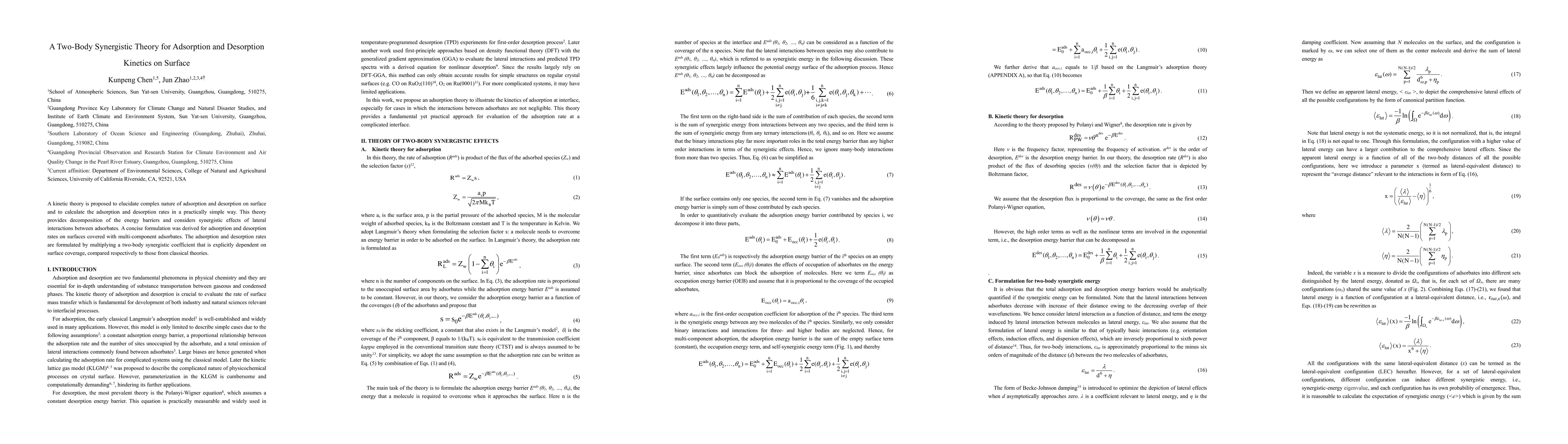 This paper proposes a kinetic theory for adsorption and desorption on surfaces, introducing a two-body synergistic coefficient to account for lateral interactions between adsorbates, leading to a more accurate calculation of adsorption and desorption rates compared to classical theories. The theory simplifies the decomposition of energy barriers and considers the synergistic effects of adsorbate interactions.
