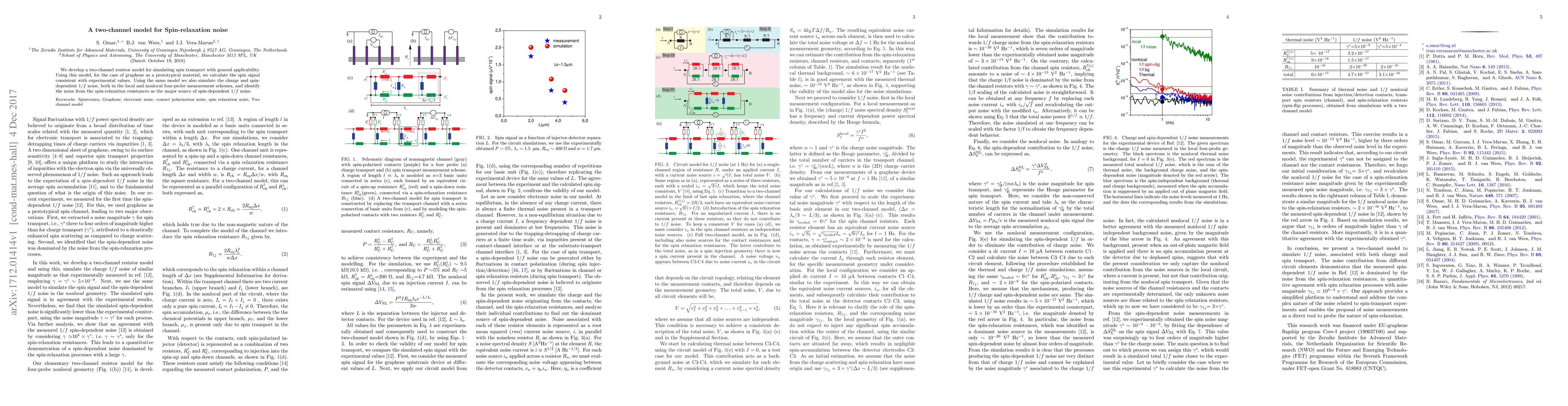 This paper introduces a two-channel resistor model for simulating spin transport in graphene, demonstrating its applicability by calculating spin signals that match experimental values. It also identifies spin-relaxation resistances as the primary source of spin-dependent 1/f noise in both local and nonlocal measurements.