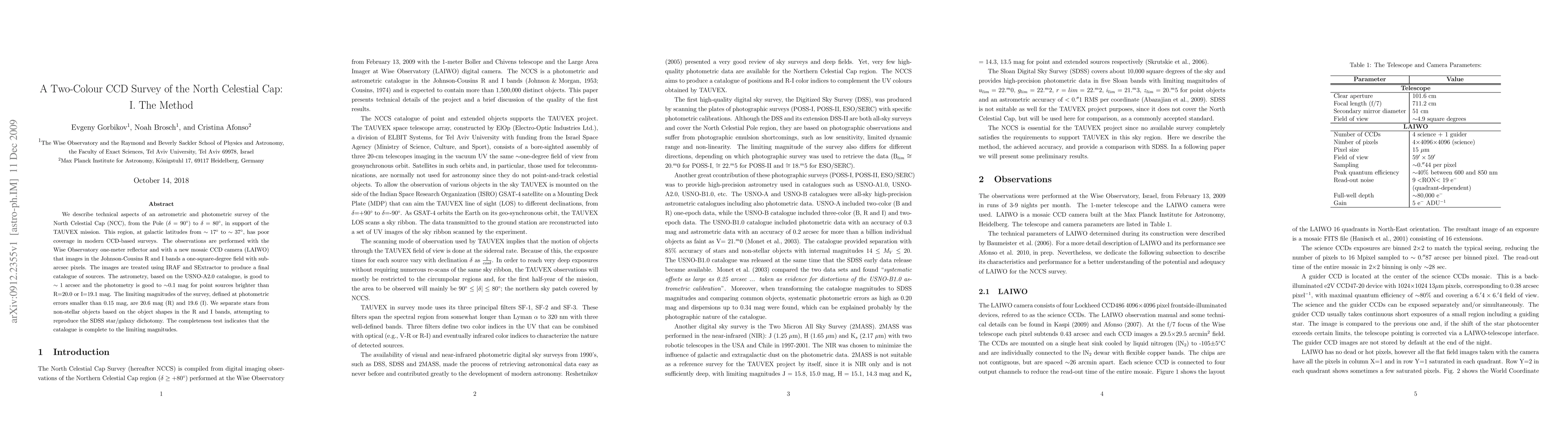 This paper details a CCD-based astrometric and photometric survey of the North Celestial Cap using the Wise Observatory's one-meter reflector and a new LAIWO mosaic CCD camera, achieving high precision in both astrometry and photometry, with the goal of supporting the TAUVEX mission.