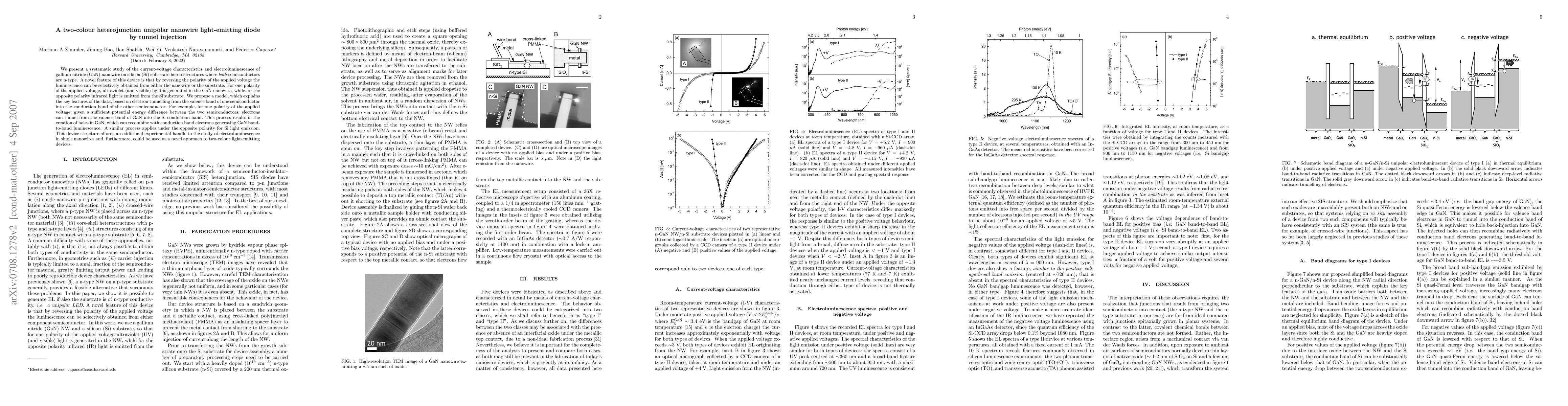We present a systematic study of the current-voltage characteristics and electroluminescence of gallium nitride (GaN) nanowire on silicon (Si) substrate heterostructures where both semiconductors are n-type. A novel feature of this device is that by reversing the polarity of the applied voltage the luminescence can be selectively obtained from either the nanowire or the substrate. For one polarity of the applied voltage, ultraviolet (and visible) light is generated in the GaN nanowire, while for the opposite polarity infrared light is emitted from the Si substrate. We propose a model, which explains the key features of the data, based on electron tunnelling from the valence band of one semiconductor into the conduction band of the other semiconductor. For example, for one polarity of the applied voltage, given a sufficient potential energy difference between the two semiconductors, electrons can tunnel from the valence band of GaN into the Si conduction band. This process results in the creation of holes in GaN, which can recombine with conduction band electrons generating GaN band-to-band luminescence. A similar process applies under the opposite polarity for Si light emission. This device structure affords an additional experimental handle to the study of electroluminescence in single nanowires and, furthermore, could be used as a novel approach to two-colour light-emitting devices.