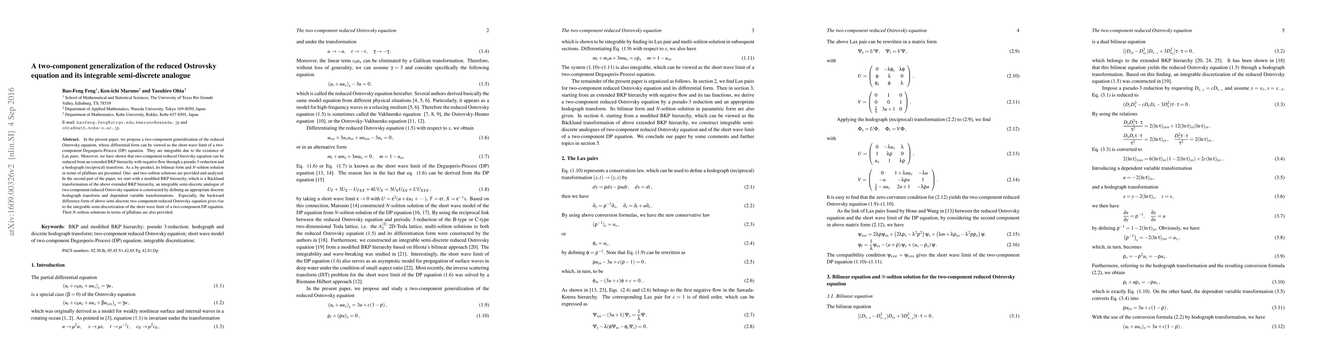 In the present paper, we propose a two-component generalization of the reduced Ostrovsky equation, whose differential form can be viewed as the short-wave limit of a two-component Degasperis-Procesi (DP) equation. They are integrable due to the existence of Lax pairs. Moreover, we have shown that two-component reduced Ostrovsky equation can be reduced from an extended BKP hierarchy with negative flow through a pseudo 3-reduction and a hodograph (reciprocal) transform. As a by-product, its bilinear form and $N$-soliton solution in terms of pfaffians are presented. One- and two-soliton solutions are provided and analyzed. In the second part of the paper, we start with a modified BKP hierarchy, which is a B\"acklund transformation of the above extended BKP hierarchy, an integrable semi-discrete analogue of two-component reduced Ostrovsky equation is constructed by defining an appropriate discrete hodograph transform and dependent variable transformations. Especially, the backward difference form of above semi-discrete two-component reduced Ostrovsky equation gives rise to the integrable semi-discretization of the short wave limit of a two-component DP equation. Their $N$-soliton solutions in terms of pffafians are also provided.