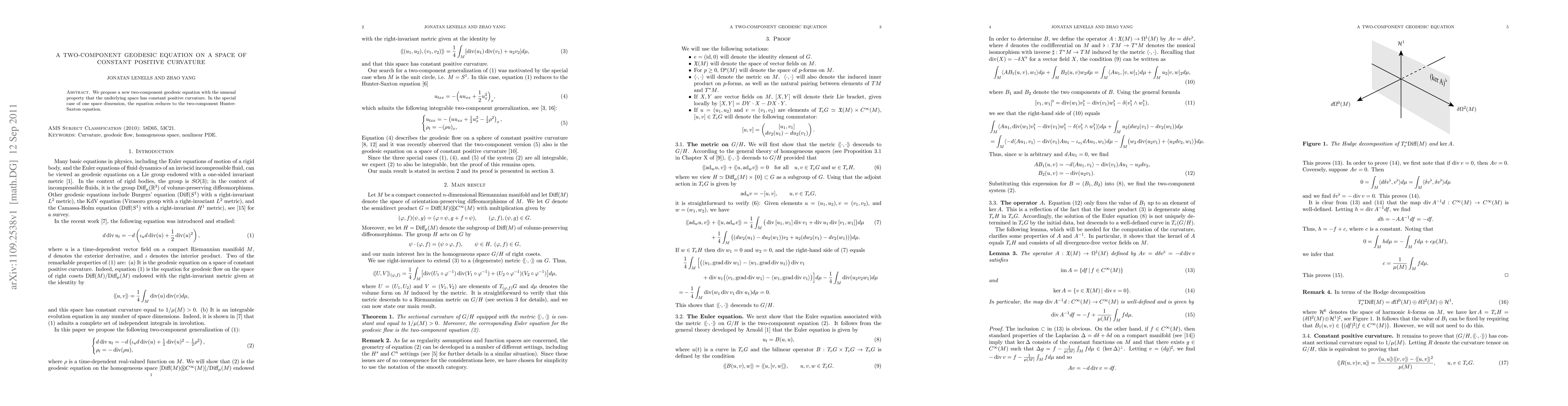 Researchers propose a new two-component geodesic equation for spaces with constant positive curvature, reducing to the Hunter-Saxton equation in one dimension.