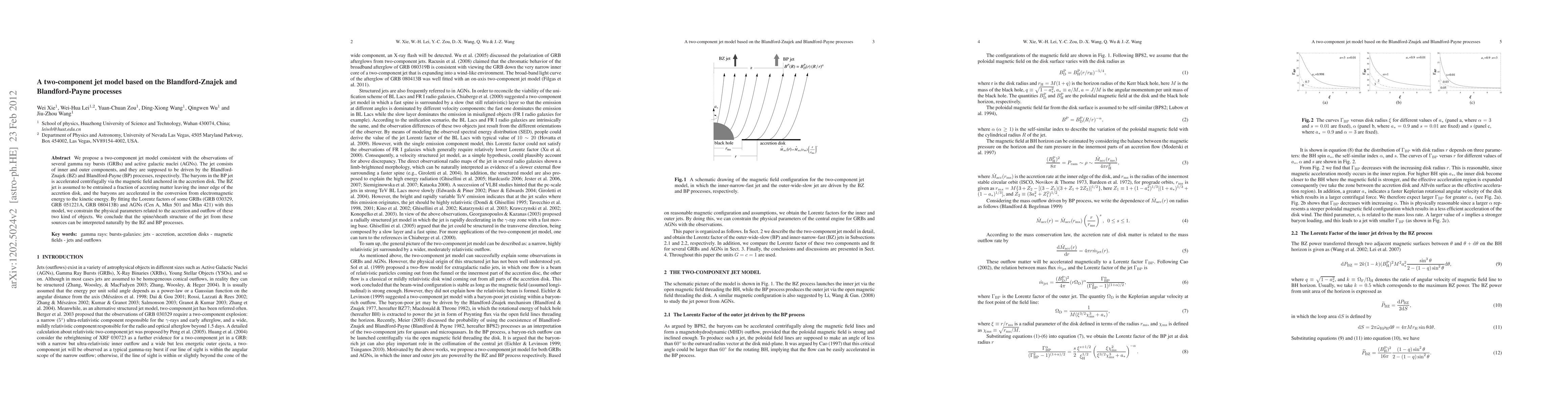 This paper proposes a two-component jet model for gamma ray bursts and active galactic nuclei, driven by Blandford-Znajek and Blandford-Payne processes. The model fits observed Lorentz factors, constraining accretion and outflow parameters, and naturally explains the spine/sheath structure of jets.