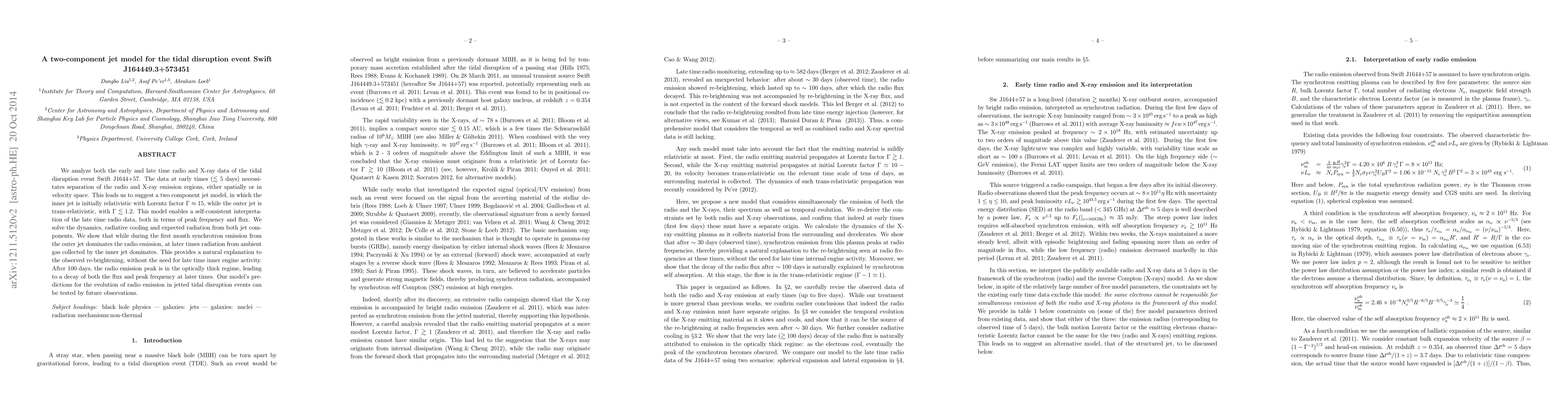 This paper proposes a two-component jet model to explain the radio and X-ray emissions of the tidal disruption event Swift J1644+57, suggesting an inner relativistic jet and an outer trans-relativistic jet. The model accounts for observed re-brightening and late-time radio data without requiring late-time engine activity.