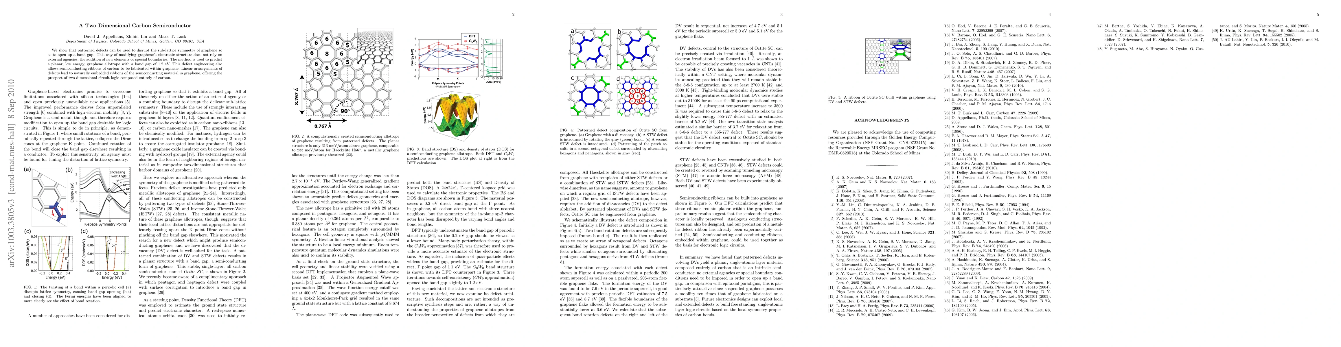 This paper demonstrates the use of patterned defects to create a band gap in graphene, achieving a two-dimensional carbon semiconductor without external modifications. The method predicts a low-energy graphene allotrope with a 1.2 eV band gap and enables fabrication of semiconducting carbon ribbons within graphene for potential carbon-based circuit logic.