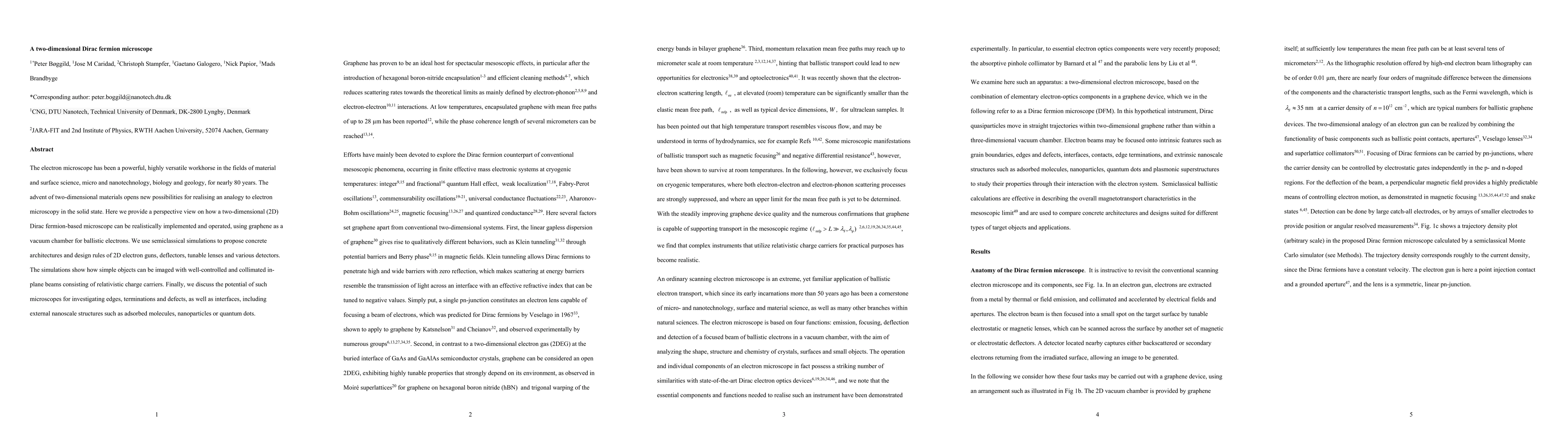 The electron microscope has been a powerful, highly versatile workhorse in the fields of material and surface science, micro and nanotechnology, biology and geology, for nearly 80 years. The advent of two-dimensional materials opens new possibilities for realising an analogy to electron microscopy in the solid state. Here we provide a perspective view on how a two-dimensional (2D) Dirac fermion-based microscope can be realistically implemented and operated, using graphene as a vacuum chamber for ballistic electrons. We use semiclassical simulations to propose concrete architectures and design rules of 2D electron guns, deflectors, tunable lenses and various detectors. The simulations show how simple objects can be imaged with well-controlled and collimated in-plane beams consisting of relativistic charge carriers. Finally, we discuss the potential of such microscopes for investigating edges, terminations and defects, as well as interfaces, including external nanoscale structures such as adsorbed molecules, nanoparticles or quantum dots.