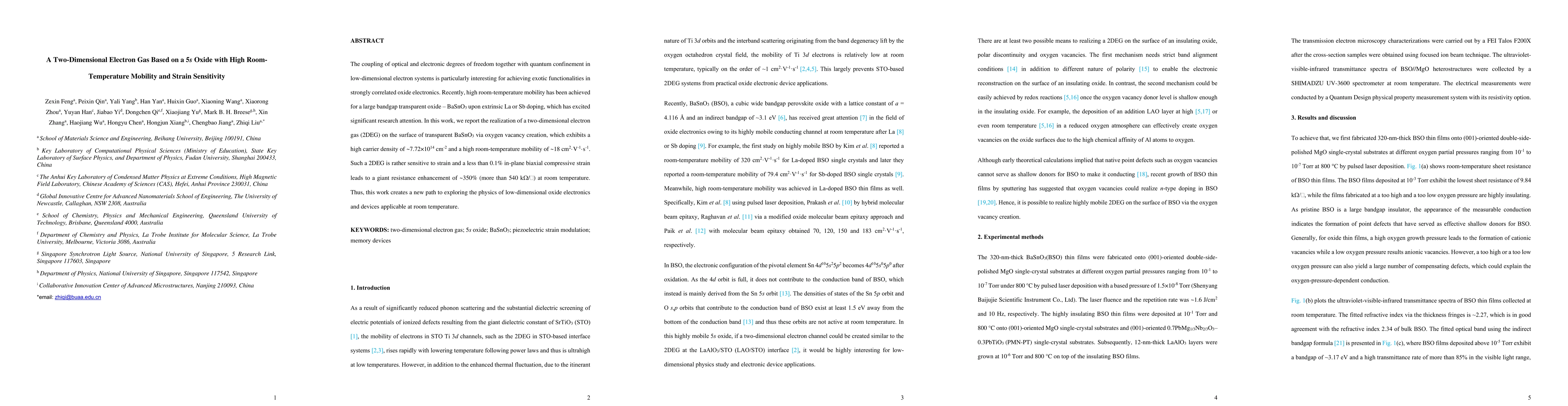 The coupling of optical and electronic degrees of freedom together with quantum confinement in low-dimensional electron systems is particularly interesting for achieving exotic functionalities in strongly correlated oxide electronics. Recently, high room-temperature mobility has been achieved for a large bandgap transparent oxide - BaSnO$_3$ upon extrinsic La or Sb doping, which has excited significant research attention. In this work, we report the observation of room-temperature ferromagnetism in BaSnO$_3$ thin films and the realization of a two-dimensional electron gas (2DEG) on the surface of transparent BaSnO$_3$ via oxygen vacancy creation, which exhibits a high carrier density of $\sim 7.72*10^{14} /{\rm cm}^2$ and a high room-temperature mobility of ~18 cm$^2$/V/s. Such a 2DEG is rather sensitive to strain and a less than 0.1% in-plane biaxial compressive strain leads to a giant resistance enhancement of 350% (more than 540 kOhm/Square) at room temperature. Thus, this work creates a new path to exploring the physics of low-dimensional oxide electronics and devices applicable at room temperature.