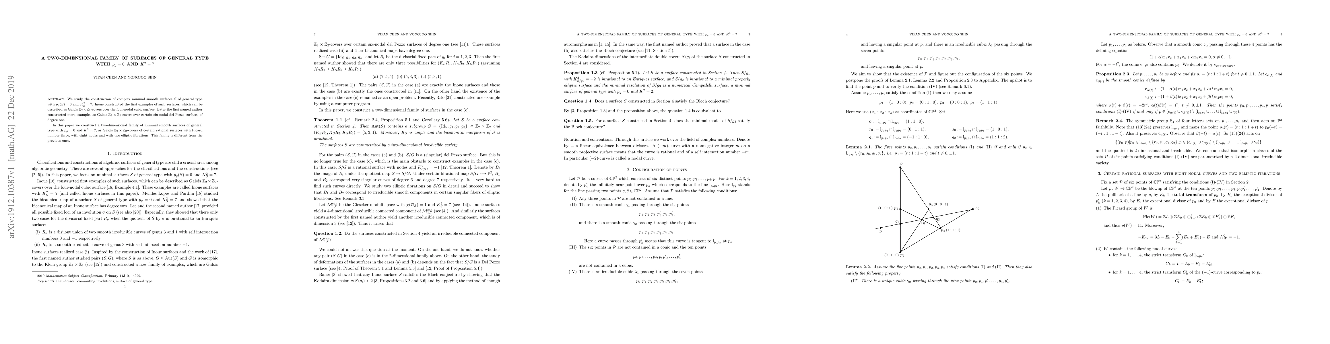 This paper constructs a two-dimensional family of minimal smooth surfaces of general type with $p_g=0$ and $K^2=7$, differing from previous examples by being Galois $\mathbb{Z}_2\times\mathbb{Z}_2$-covers of certain rational surfaces with eight nodes and two elliptic fibrations.