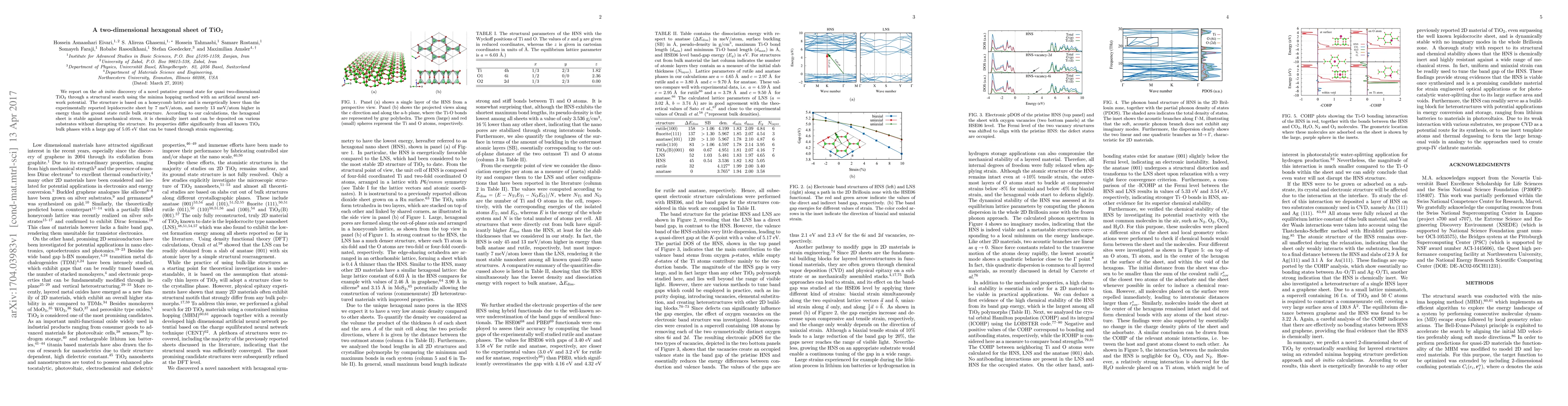 We report on the ab initio discovery of a novel putative ground state for quasi two-dimensional TiO$_2$ through a structural search using the minima hopping method with an artificial neural network potential. The structure is based on a honeycomb lattice and is energetically lower than the experimentally reported lepidocrocite sheet by 7~meV/atom, and merely 13~meV/atom higher in energy than the ground state rutile bulk structure. According to our calculations, the hexagonal sheet is stable against mechanical stress, it is chemically inert and can be deposited on various substrates without disrupting the structure. Its properties differ significantly from all known TiO$_2$ bulk phases with a large gap of 5.05~eV that can be tuned through strain engineering.