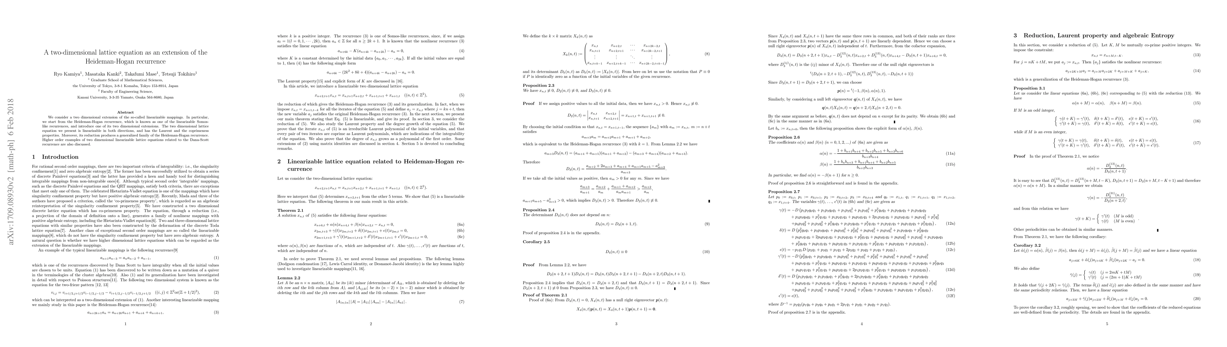 This paper extends the Heideman-Hogan recurrence into a two-dimensional lattice equation, maintaining linearizability and the Laurent and coprimeness properties. The new equation reduces to a generalized family of the original recurrence and explores higher order examples related to the Dana-Scott recurrence.