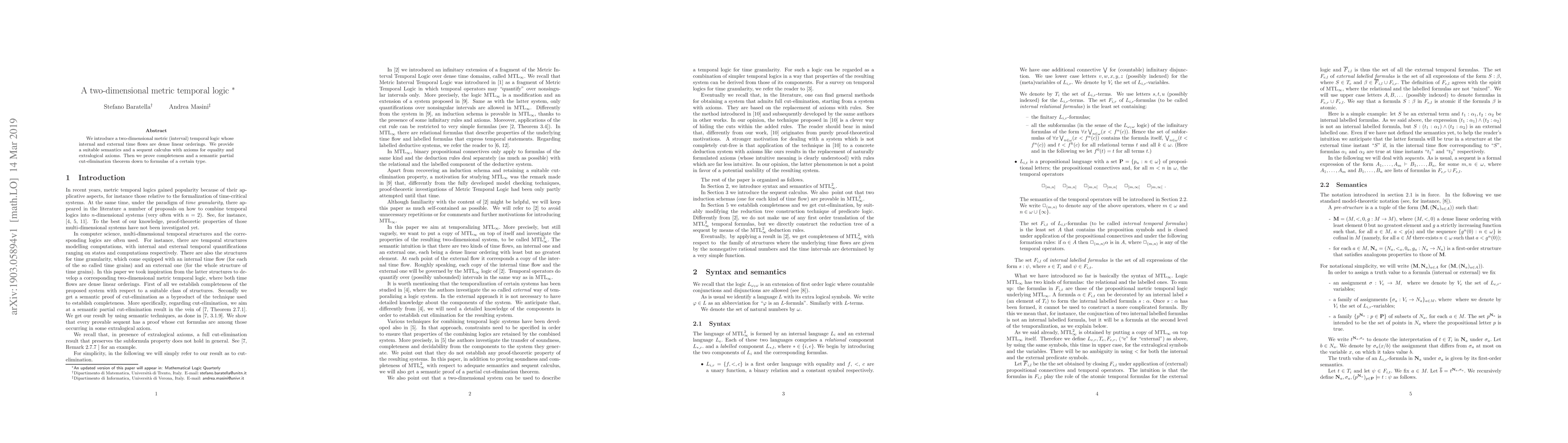 This paper introduces a two-dimensional metric temporal logic with dense linear orderings for internal and external time flows, providing a sequent calculus and proving completeness along with a semantic partial cut-elimination theorem for specific formulas.