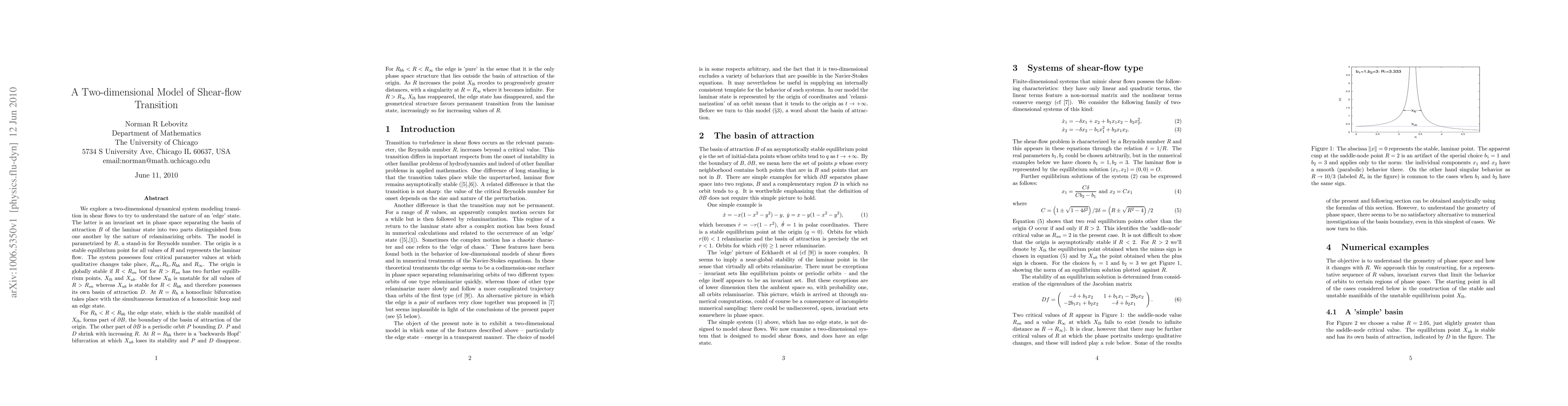 This paper investigates a two-dimensional dynamical system that models the transition in shear flows, focusing on the emergence and characteristics of an 'edge' state. The system's stability and bifurcations are analyzed across various critical Reynolds number thresholds, revealing the transition from laminar to turbulent flow and the role of the edge state in separating different relaminarizing orbits.