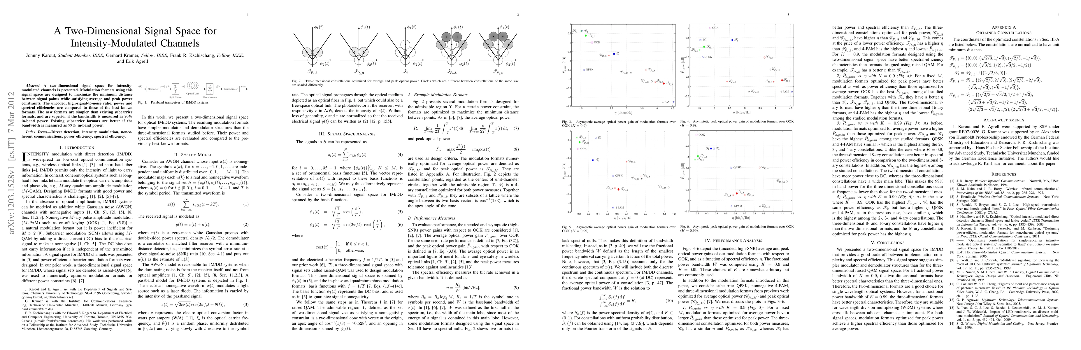 This paper introduces a two-dimensional signal space for intensity-modulated channels that maximizes minimum distance between signal points under power constraints. The proposed modulation formats show superior power and spectral efficiency compared to existing subcarrier formats when bandwidth is defined by 90% in-band power.