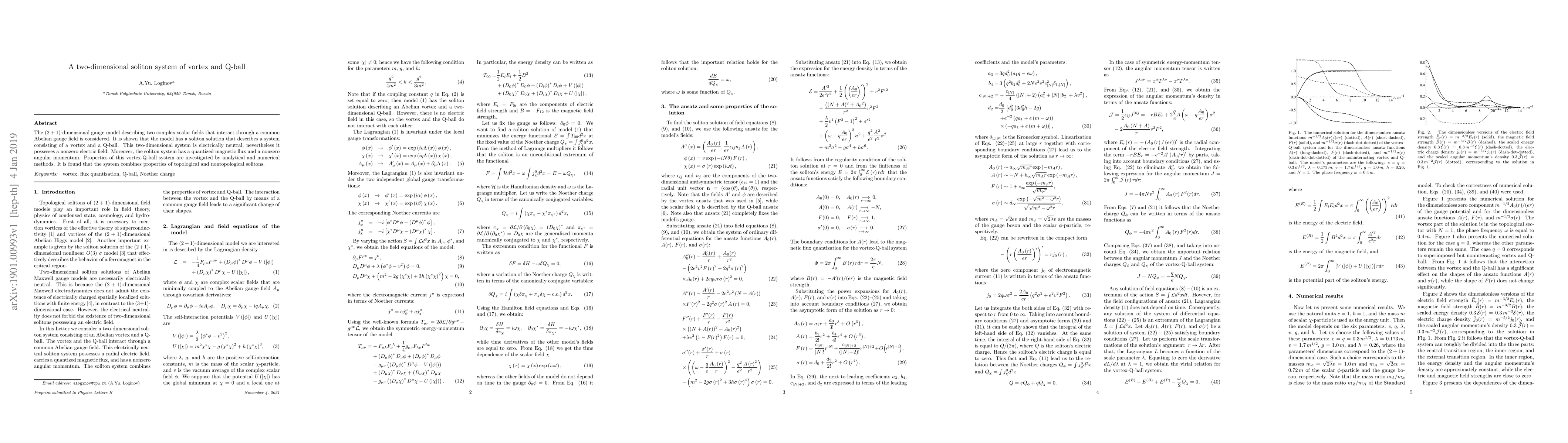 The (2 + 1)-dimensional gauge model describing two complex scalar fields that interact through a common Abelian gauge field is considered. It is shown that the model has a soliton solution that describes a system consisting of a vortex and a Q-ball. This two-dimensional system is electrically neutral, nevertheless it possesses a nonzero electric field. Moreover, the soliton system has a quantized magnetic flux and a nonzero angular momentum. Properties of this vortex-Q-ball system are investigated by analytical and numerical methods. It is found that the system combines properties of topological and nontopological solitons.