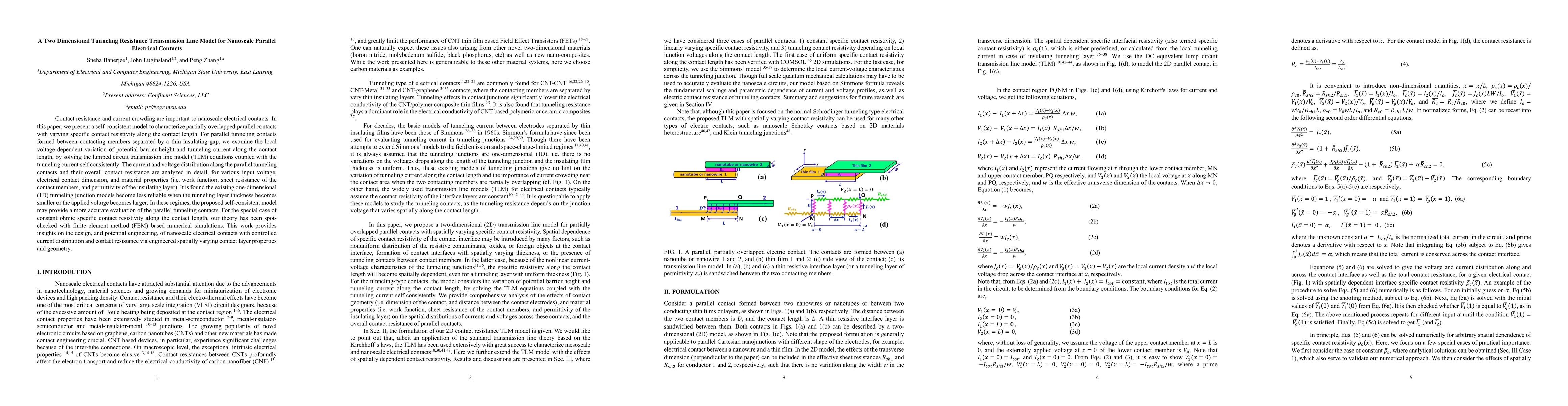 This paper presents a self-consistent two-dimensional tunneling resistance transmission line model to characterize nanoscale parallel electrical contacts, addressing contact resistance and current crowding. The model evaluates the voltage-dependent potential barrier and tunneling current variations along the contact length, providing a more accurate assessment than one-dimensional models for small tunneling layers and high voltages.
