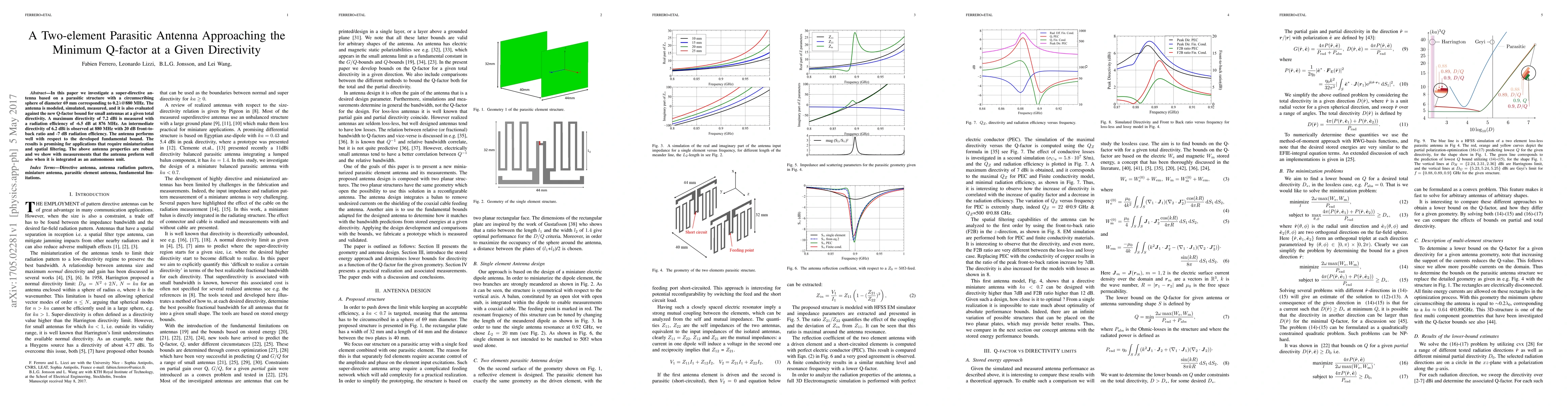 This paper presents a super-directive parasitic antenna achieving a maximum directivity of 7.2 dBi with a low Q-factor, demonstrating performance near the theoretical minimum bound for small antennas. The antenna shows robustness and effective integration as an autonomous unit, promising for miniaturized applications requiring spatial filtering.