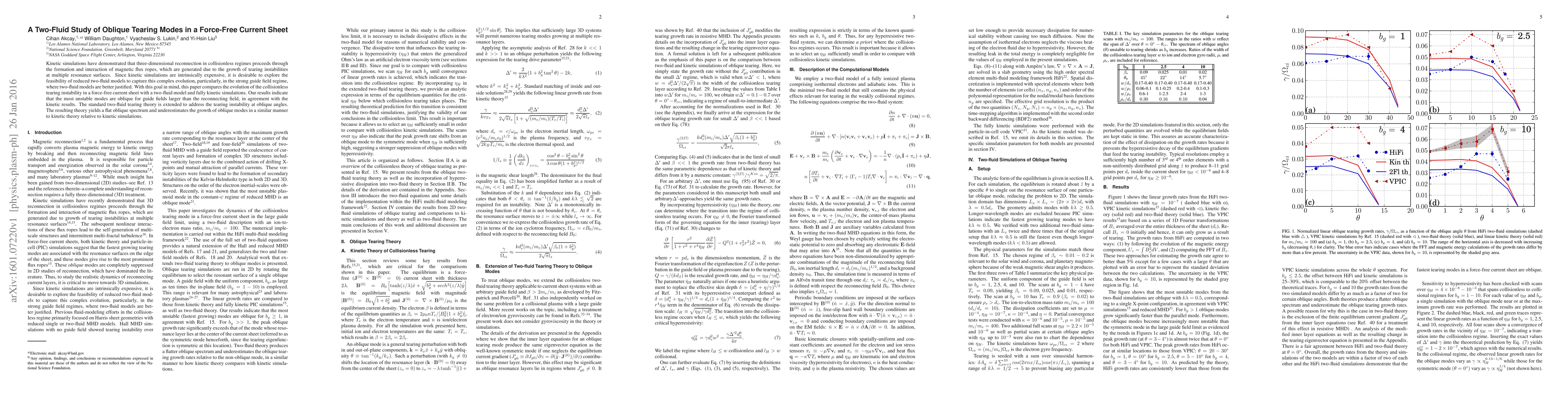 This paper compares the evolution of the collisionless tearing instability in a force-free current sheet using a two-fluid model and kinetic simulations, finding that oblique modes dominate for strong guide fields. The study extends standard two-fluid theory to oblique angles, showing agreement with kinetic results but noting underestimations in growth rates.