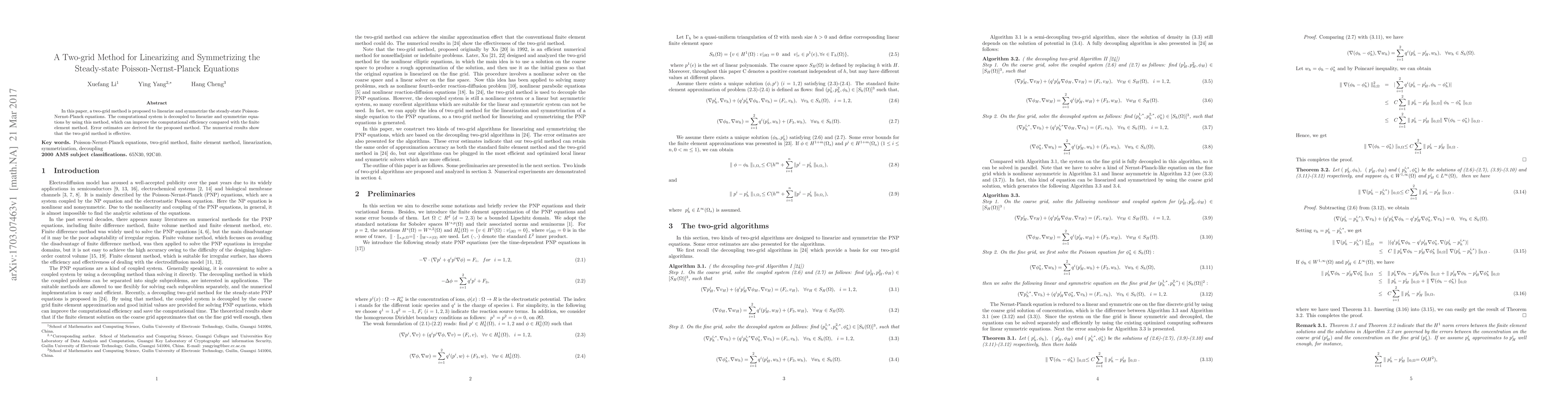 This paper proposes a two-grid method to linearize and symmetrize the steady-state Poisson-Nernst-Planck equations, decoupling the computational system to enhance efficiency over the finite element method. The method's effectiveness is demonstrated through derived error estimates and numerical results.