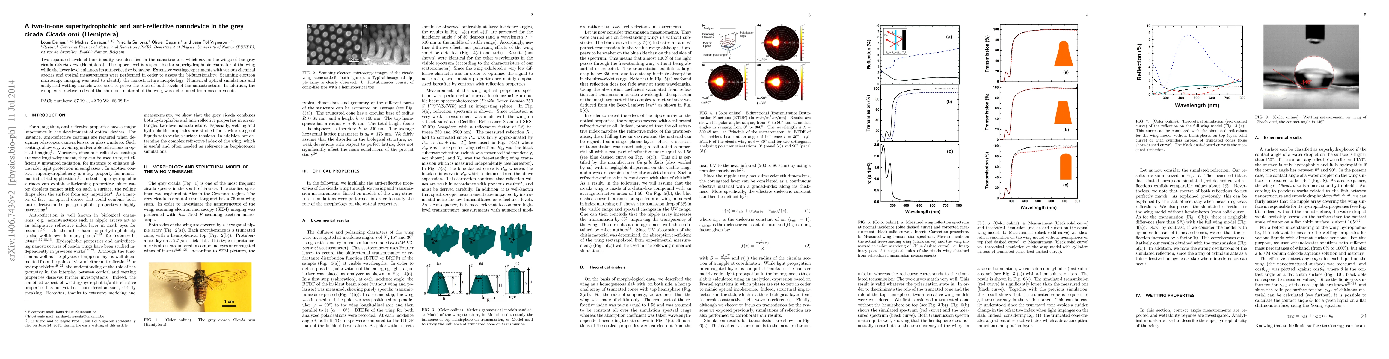 Two separated levels of functionality are identified in the nanostructure which covers the wings of the grey cicada $\textit{Cicada orni}$ (Hemiptera). The upper level is responsible for superhydrophobic character of the wing while the lower level enhances its anti-reflective behavior. Extensive wetting experiments with various chemical species and optical measurements were performed in order to assess the bi-functionality. Scanning electron microscopy imaging was used to identify the nanostructure morphology. Numerical optical simulations and analytical wetting models were used to prove the roles of both levels of the nanostructure. In addition, the complex refractive index of the chitinous material of the wing was determined from measurements.