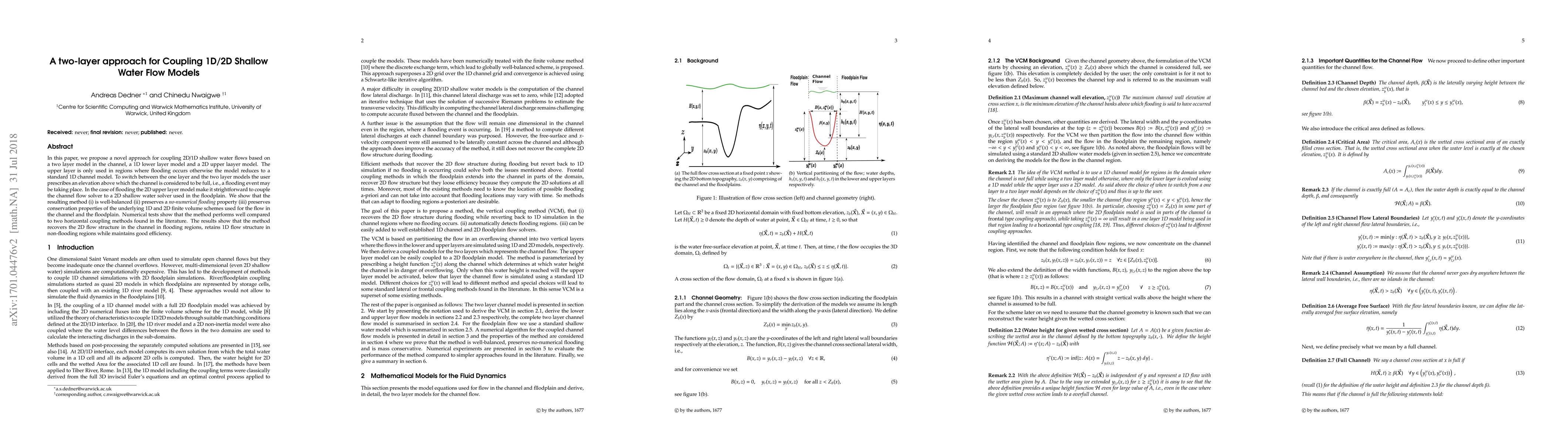 The paper introduces a Vertical Coupling Method (VCM) for 1D/2D shallow water flow models, enabling efficient simulation of open channel flow and flooding. VCM treats the channel flow as two layers (1D lower, 2D upper), allowing recovery of 2D flow structure without efficiency loss, adaptability to flow situations, and preservation of conservation properties.