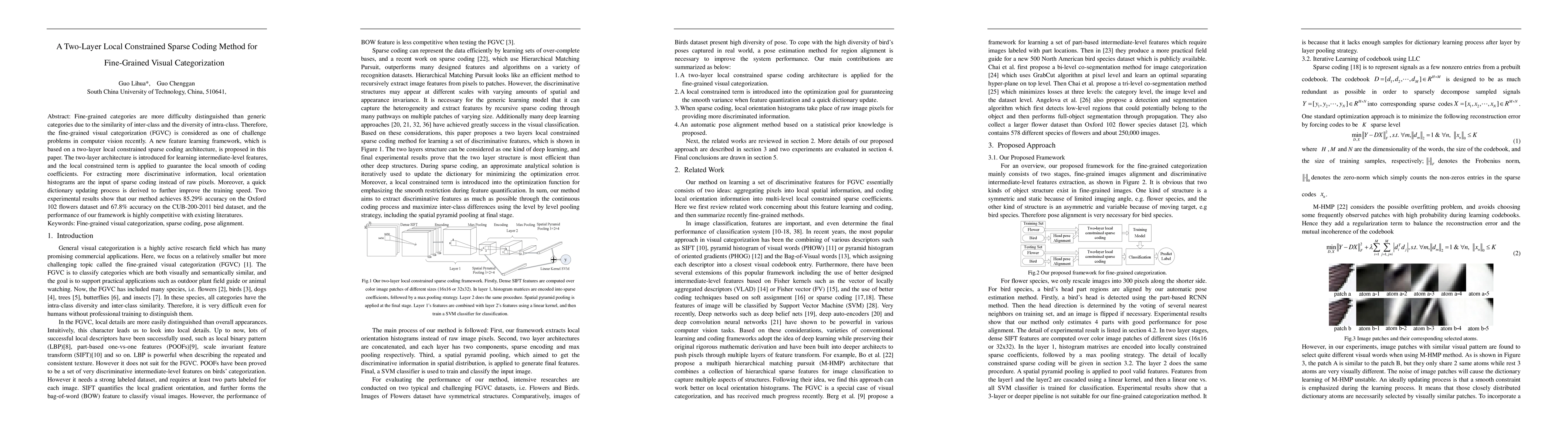 A new feature learning framework using a two-layer local constrained sparse coding architecture achieves high accuracy in fine-grained visual categorization tasks on flower and bird datasets.