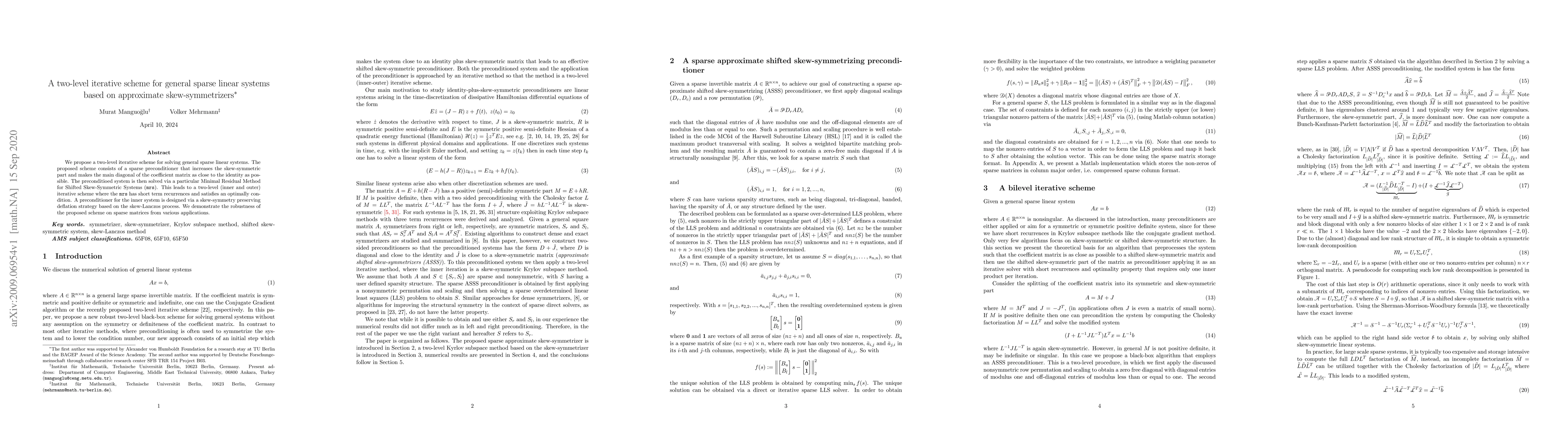 This paper introduces a two-level iterative scheme for solving sparse linear systems, utilizing a preconditioner that enhances the skew-symmetric part of the matrix and aligns the main diagonal with the identity. The scheme employs a Minimal Residual Method for Shifted Skew-Symmetric Systems (MRS) and demonstrates robustness across diverse applications.