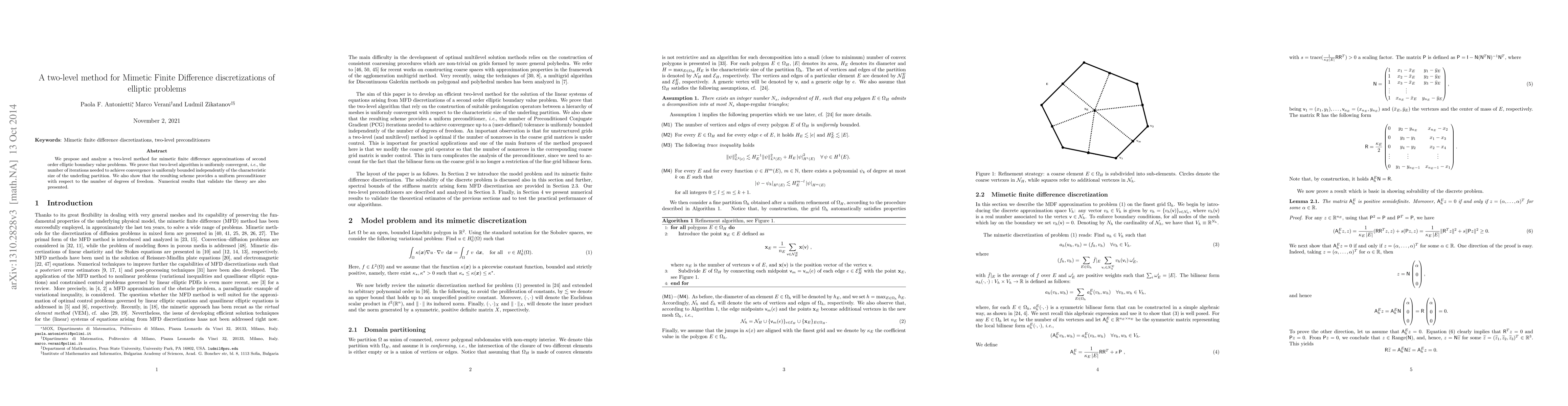 Researchers developed a two-level method for solving elliptic boundary value problems using mimetic finite difference discretizations, demonstrating uniform convergence and a uniform preconditioner.