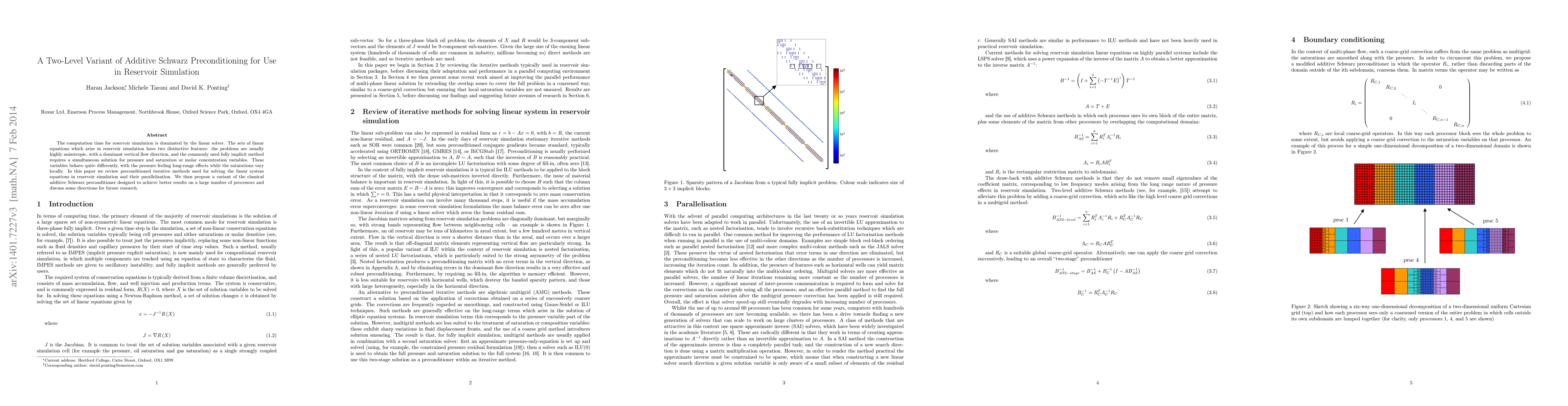 A new variant of additive Schwarz preconditioning is proposed for efficient reservoir simulation using a two-level approach to handle anisotropy and different variable behaviors, aiming to improve parallelization on large processors.