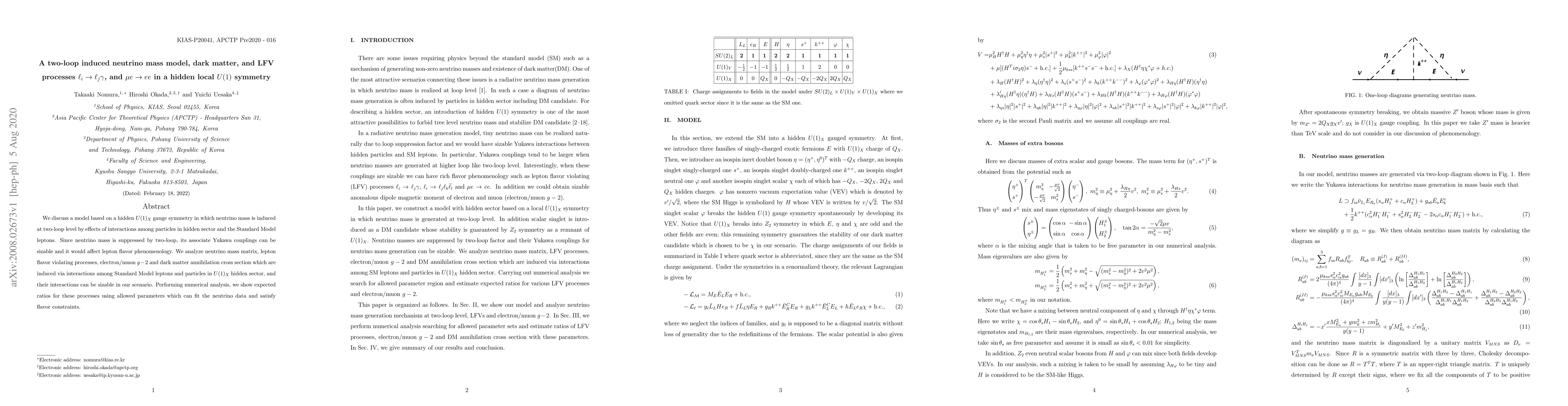 This paper proposes a two-loop induced neutrino mass model within a hidden $U(1)_X$ gauge symmetry framework, where neutrino masses arise from interactions between the Standard Model and hidden sector particles. It explores the implications for lepton flavor violation processes, electron/muon $g-2$, and dark matter, demonstrating sizable interaction effects and fitting the neutrino data.