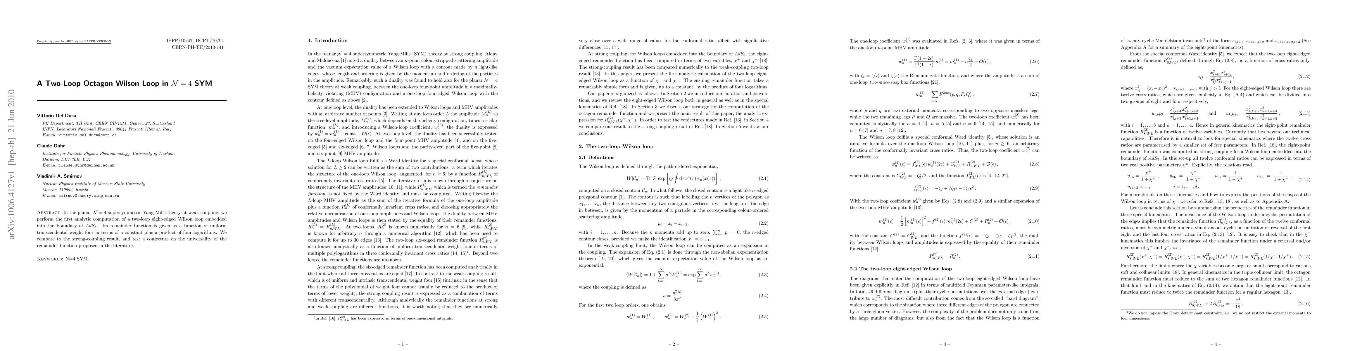 Researchers computed the first two-loop Wilson loop in N = 4 SYM theory, finding its remainder function as a constant plus four logarithms, with implications for strong-coupling results and universality conjectures.