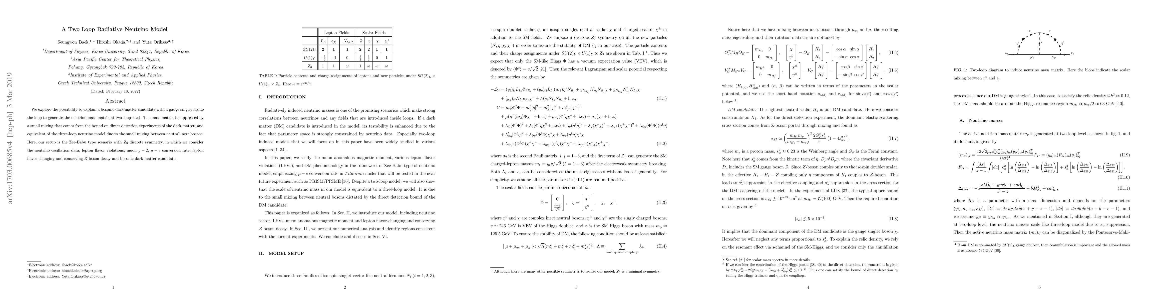 The paper presents a novel two-loop radiative neutrino mass generation model incorporating a bosonic dark matter candidate, utilizing a Zee-Babu type scenario with Z3 discrete symmetry.