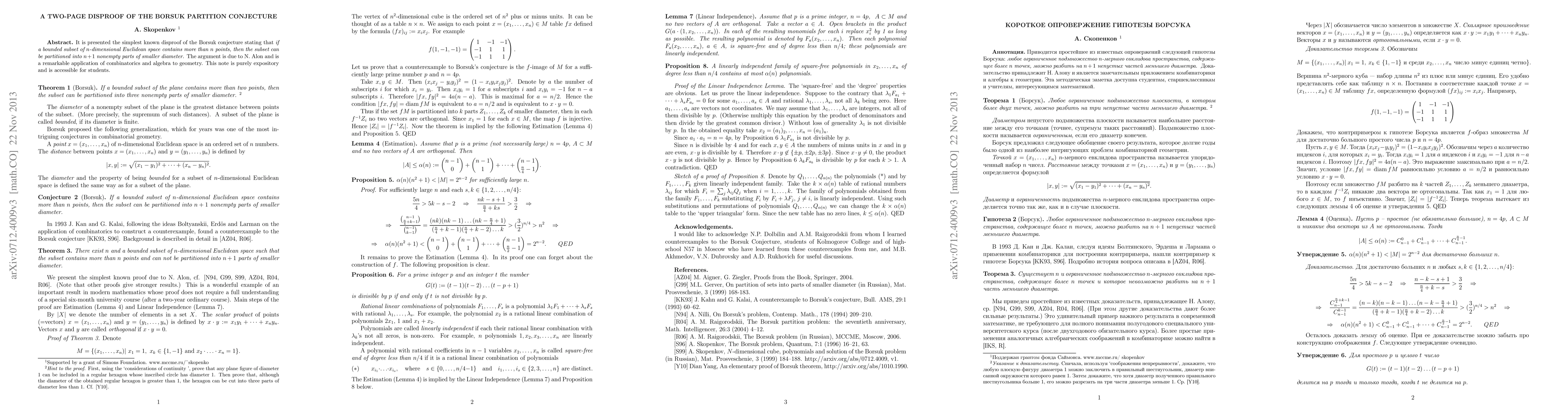 It is presented the simplest known disproof of the Borsuk conjecture stating that if a bounded subset of n-dimensional Euclidean space contains more than n points, then the subset can be partitioned into n+1 nonempty parts of smaller diameter. The argument is due to N. Alon and is a remarkable application of combinatorics and algebra to geometry. This note is purely expository and is accessible for students.