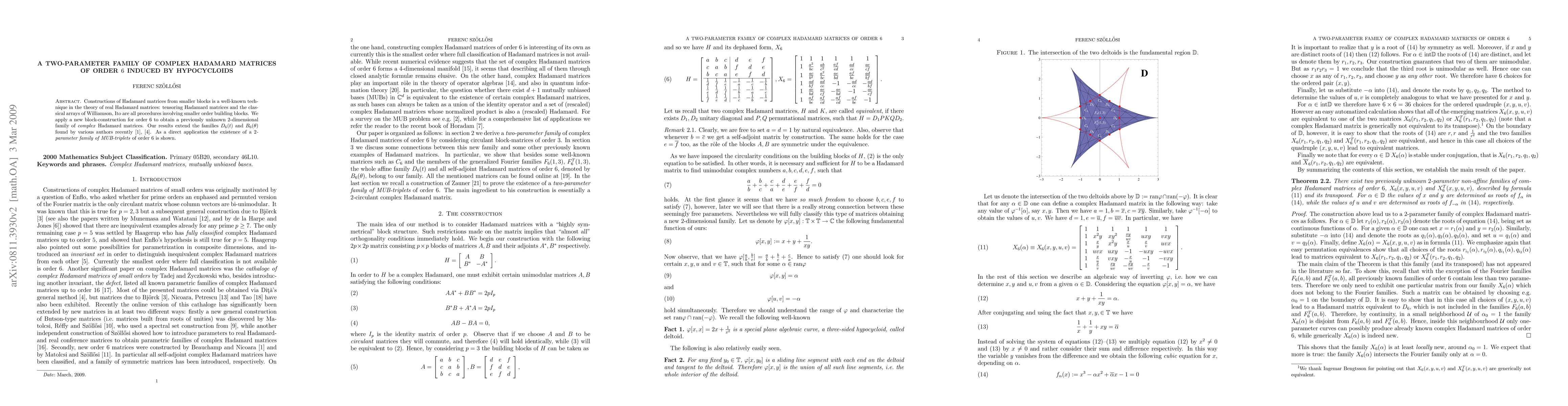 Constructions of Hadamard matrices from smaller blocks is a well-known technique in the theory of real Hadamard matrices: tensoring Hadamard matrices and the classical arrays of Williamson, Ito are all procedures involving smaller order building blocks. We apply a new block-construction for order 6 to obtain a previously unknown 2-dimensional family of complex Hadamard matrices. Our results extend the families D_6(t) and B_6(t) found by various authors recently. As a direct application the existence of a 2-parameter family of MUB-triplets of order 6 is shown.