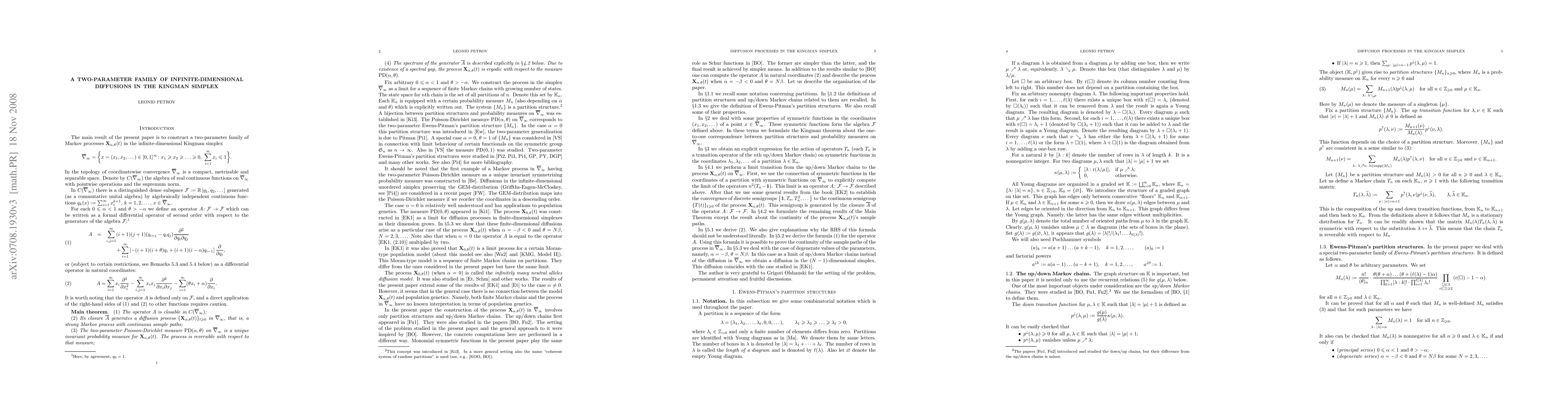 The aim of the paper is to introduce a two-parameter family of infinite-dimensional diffusion processes X(alpha,theta) related to Pitman's two-parameter Poisson-Dirichlet distributions PD(alpha,theta). The diffusions X(alpha,theta) are obtained in a scaling limit transition from certain finite Markov chains on partitions of natural numbers. The state space of X(alpha,theta) is an infinite-dimensional simplex called the Kingman simplex. In the special case when parameter alpha vanishes, our finite Markov chains are similar to Moran-type model in population genetics, and our diffusion processes reduce to the infinitely-many-neutral-alleles diffusion model studied by Ethier and Kurtz (1981). Our main results extend those of Ethier and Kurtz to the two-parameter case and are as follows: The Poisson-Dirichlet distribution PD(alpha,theta) is a unique stationary distribution for the corresponding process X(alpha,theta); the process is ergodic and reversible; the spectrum of its generator is explicitly described. The general two-parameter case seems to fall outside the setting of models of population genetics, and our approach differs in some aspects from that of Ethier and Kurtz. We also consider the case of degenerate series of parameters alpha and theta and conclude that the diffusions in finite-dimensional simplexes studied by Ethier and Kurtz (1981) arise as a special case of our two-parameter family of diffusions.
