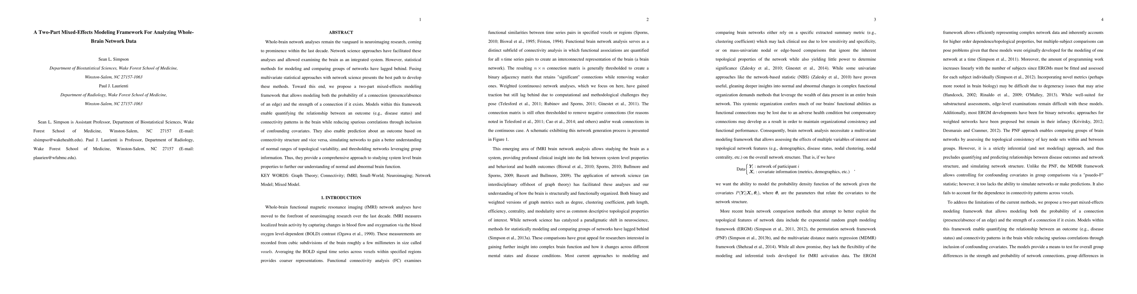 This paper proposes a two-part mixed-effects modeling framework for analyzing whole-brain network data, enabling the modeling of both connection presence/absence and strength. The framework aims to advance statistical methods for comparing network groups and to better understand brain connectivity patterns in relation to outcomes like disease status.