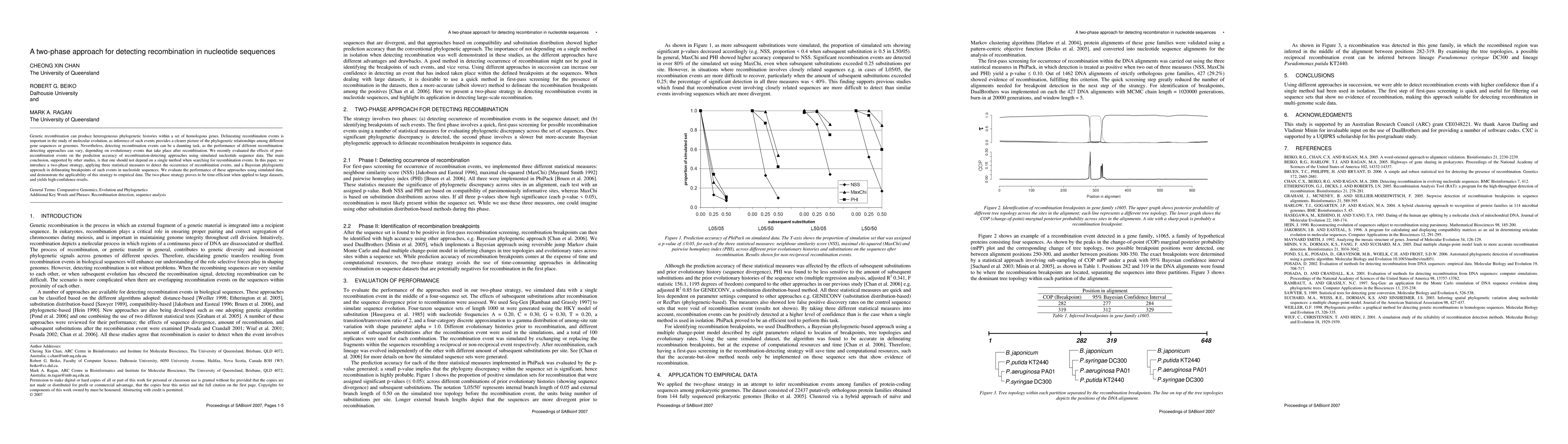 A new two-phase approach detects recombination in nucleotide sequences using multiple statistical measures and a Bayesian phylogenetic method, achieving high accuracy and efficiency on both simulated and empirical data.