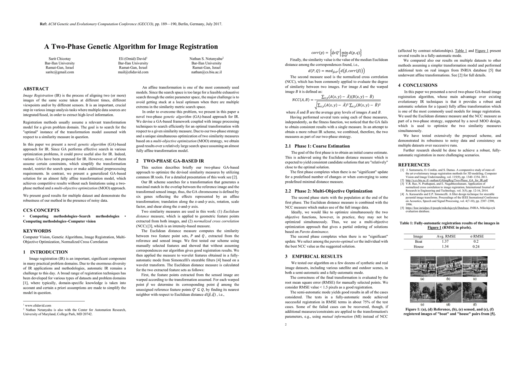 Image Registration (IR) is the process of aligning two (or more) images of the same scene taken at different times, different viewpoints and/or by different sensors. It is an important, crucial step in various image analysis tasks where multiple data sources are integrated/fused, in order to extract high-level information. Registration methods usually assume a relevant transformation model for a given problem domain. The goal is to search for the "optimal" instance of the transformation model assumed with respect to a similarity measure in question. In this paper we present a novel genetic algorithm (GA)-based approach for IR. Since GA performs effective search in various optimization problems, it could prove useful also for IR. Indeed, various GAs have been proposed for IR. However, most of them assume certain constraints, which simplify the transformation model, restrict the search space or make additional preprocessing requirements. In contrast, we present a generalized GA-based solution for an almost fully affine transformation model, which achieves competitive results without such limitations using a two-phase method and a multi-objective optimization (MOO) approach. We present good results for multiple dataset and demonstrate the robustness of our method in the presence of noisy data.