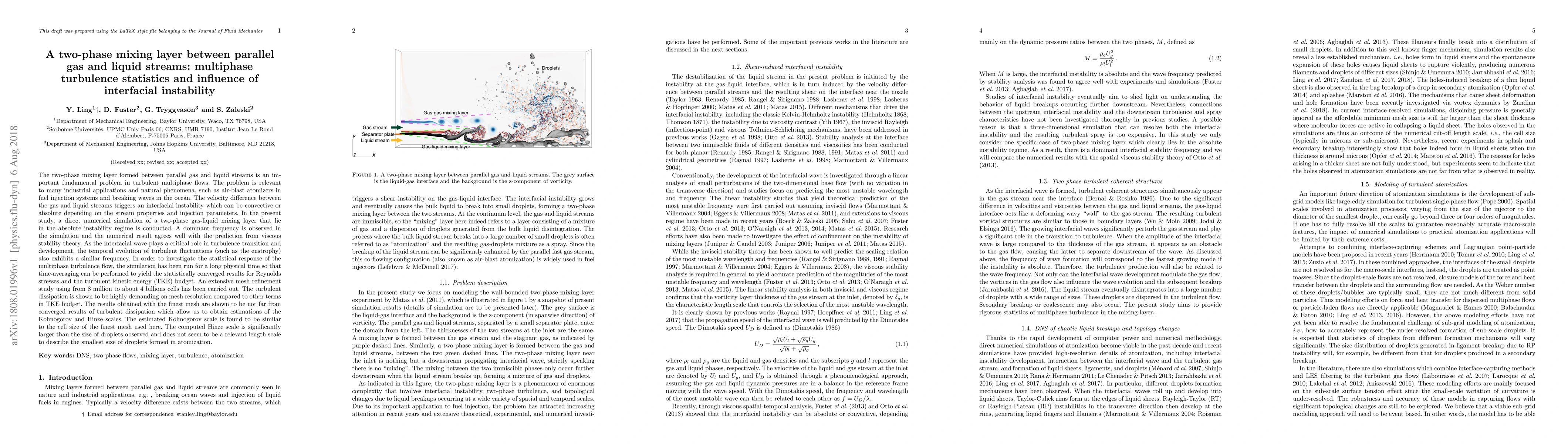 This study uses direct numerical simulation to analyze the turbulence statistics in a two-phase gas-liquid mixing layer, focusing on the influence of interfacial instability. The simulation reveals a dominant frequency linked to the interfacial wave and shows that turbulent dissipation requires high mesh resolution, leading to estimates of Kolmogorov and Hinze scales, though the latter is not a suitable measure for droplet size in atomization.