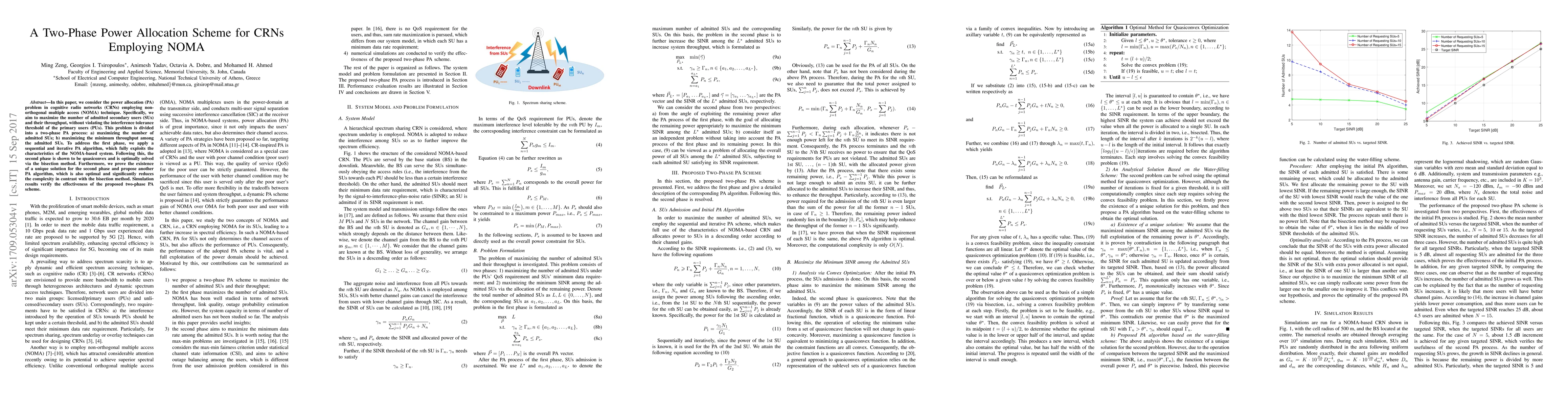 This paper proposes a two-phase power allocation scheme for cognitive radio networks using nonorthogonal multiple access (NOMA) to maximize secondary users' admission and throughput while respecting primary users' interference limits. The first phase uses a sequential algorithm to maximize the number of admitted users, followed by a second phase using a bisection method to maximize minimum throughput, with a complexity-reduced alternative also proposed.