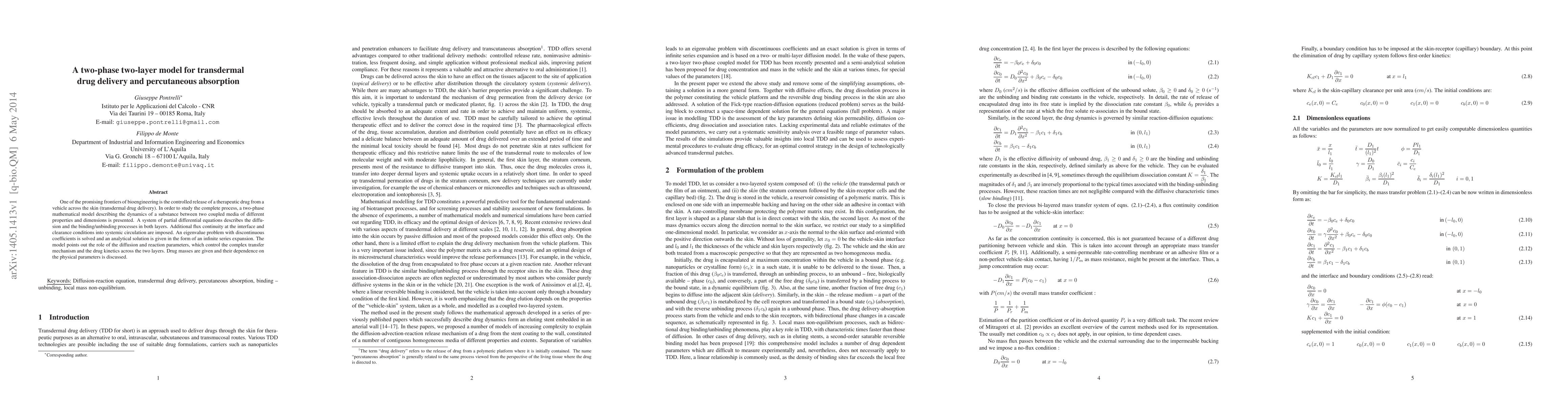 One of the promising frontiers of bioengineering is the controlled release of a therapeuticdrug from a vehicle across the skin (transdermal drug delivery). In order to study the complete process, a two-phase mathematical model describing the dynamics of a substance between two coupled media of different properties and dimensions is presented. A system of partial differential equations describes the diffusion and the binding/unbinding processes in both layers. Additional flux continuity at the interface and clearance conditions into systemic circulation are imposed. An eigenvalue problem with discontinuous coefficients is solved and an analytical solution is given in the form of an infinite series expansion. The model points out the role of the diffusion and reaction parameters, which control the complex transfer mechanism and the drug kinetics across the two layers. Drug masses are given and their dependence on the physical parameters is discussed.