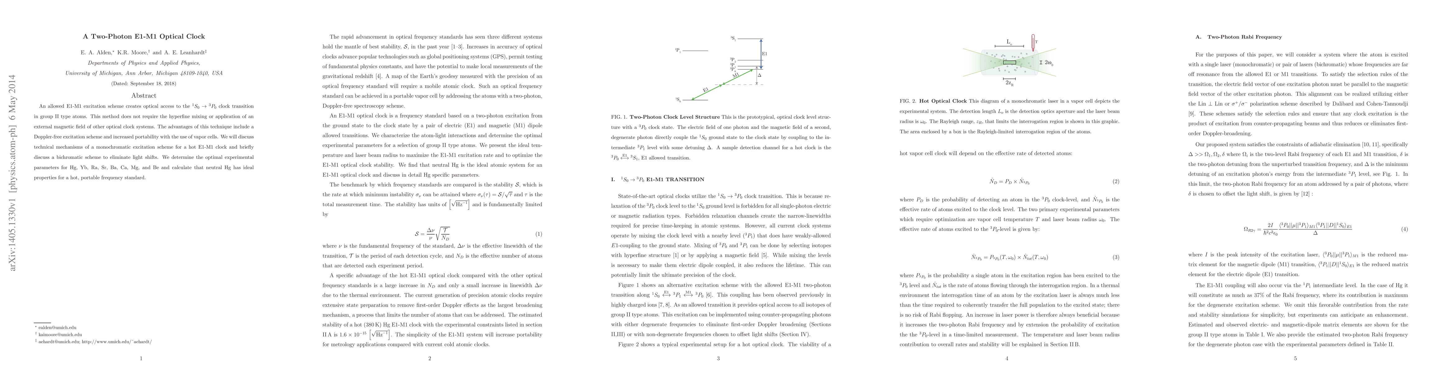 An allowed E1-M1 excitation scheme creates optical access to the ${^1S_0} \rightarrow {^3P_0}$ clock transition in group II type atoms. This method does not require the hyperfine mixing or application of an external magnetic field of other optical clock systems. The advantages of this technique include a Doppler-free excitation scheme and increased portability with the use of vapor cells. We will discuss technical mechanisms of a monochromatic excitation scheme for a hot E1-M1 clock and briefly discuss a bichromatic scheme to eliminate light shifts. We determine the optimal experimental parameters for Hg, Yb, Ra, Sr, Ba, Ca, Mg, and Be and calculate that neutral Hg has ideal properties for a hot, portable frequency standard.