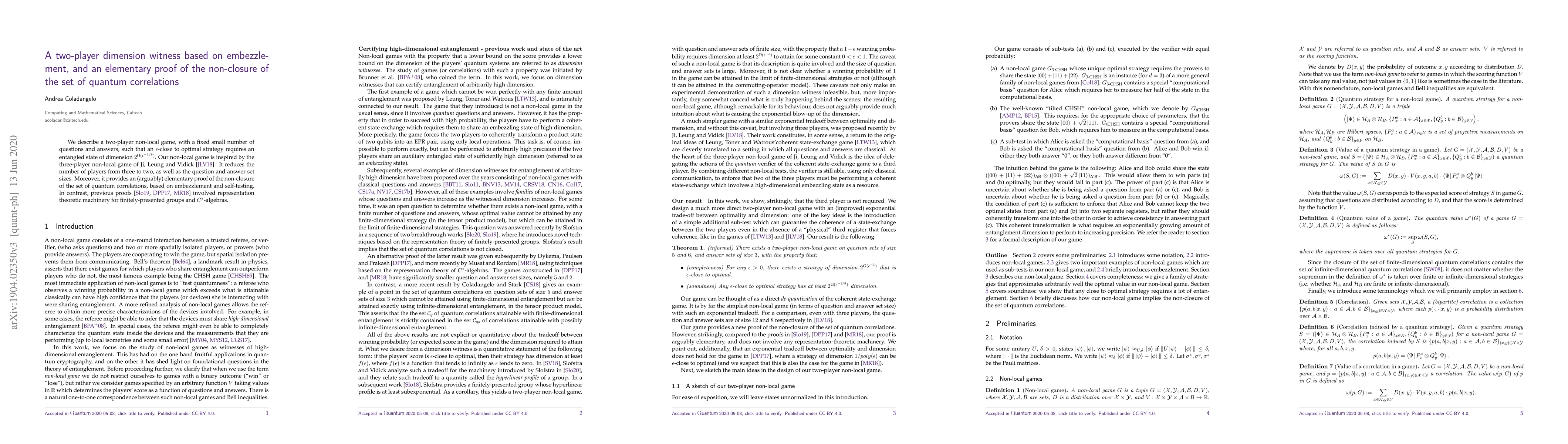 This paper presents a two-player non-local game requiring an entangled state of dimension $2^{\Omega(\epsilon^{-1/8})}$ for an $\epsilon$-close to optimal strategy, reducing complexity from a three-player game. It also provides an elementary proof of the non-closure of quantum correlations using embezzlement and self-testing, contrasting with previous proofs relying on complex representation theory.