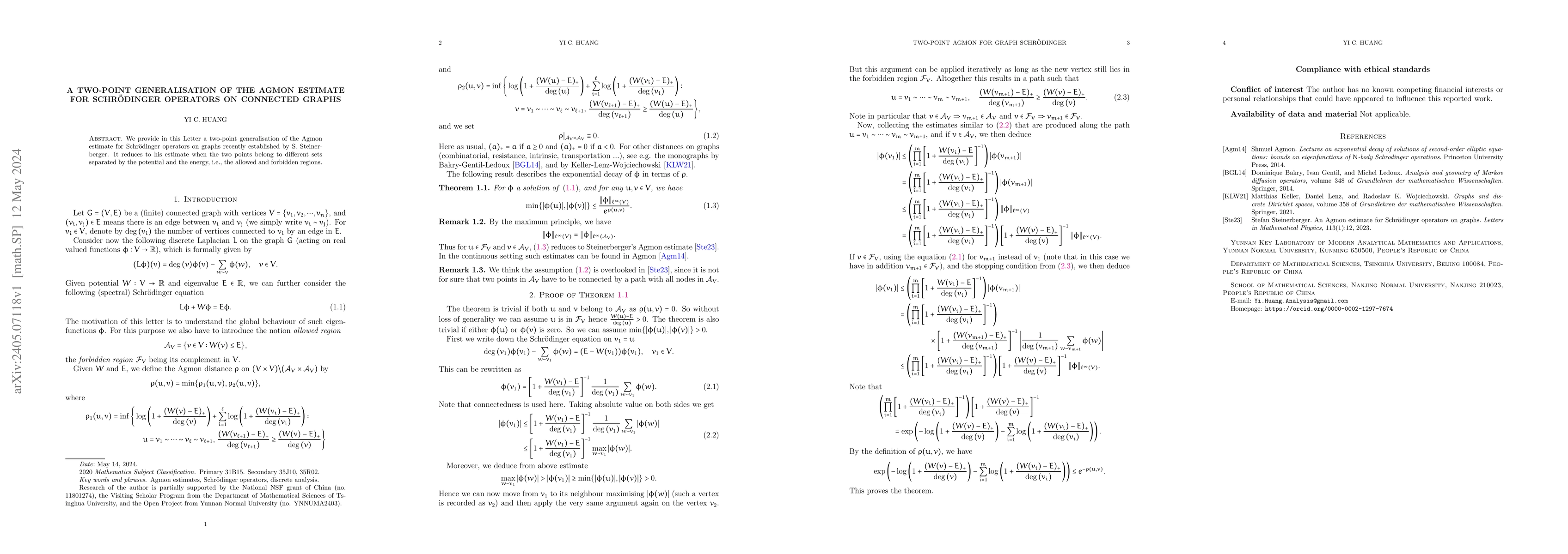 Summary: This paper extends the Agmon estimate for Schrödinger operators on connected graphs to a two-point version, generalizing previous work by S. Steinerberger, which applies when the points lie in distinct potential regions.