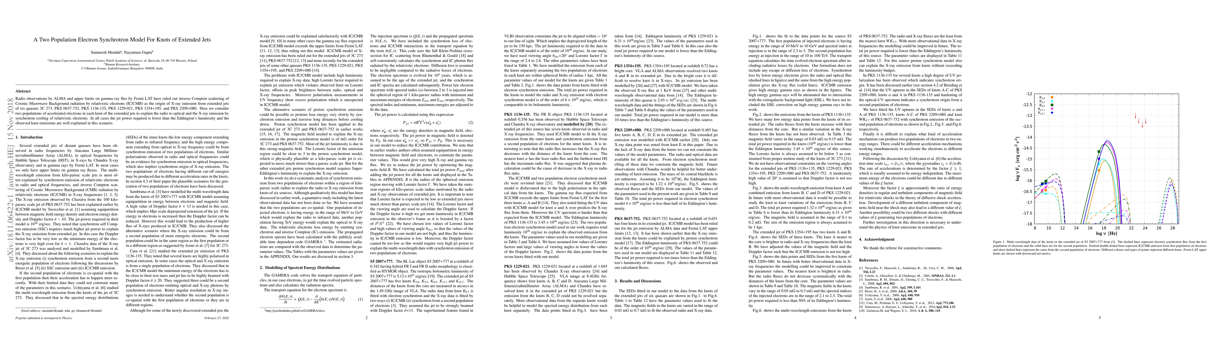 Radio observations by ALMA and upper limits on gamma ray flux by Fermi LAT have ruled out inverse Compton scattering of Cosmic Microwave Background radiation by relativistic electrons (IC/CMB) as the origin of X-ray emission from extended jets of six quasars 3C 273, PKS 0637-752, PKS 1136-135, PKS 1229-021, PKS 1354+195, and PKS 2209+080. Here we consider two populations of accelerated electrons in each knot of the extended jets to explain the radio to optical and the X-ray emission by synchrotron cooling of relativistic electrons. In all cases the jet power required is lower than the Eddington's luminosity and the observed knot emissions are well explained in this scenario.