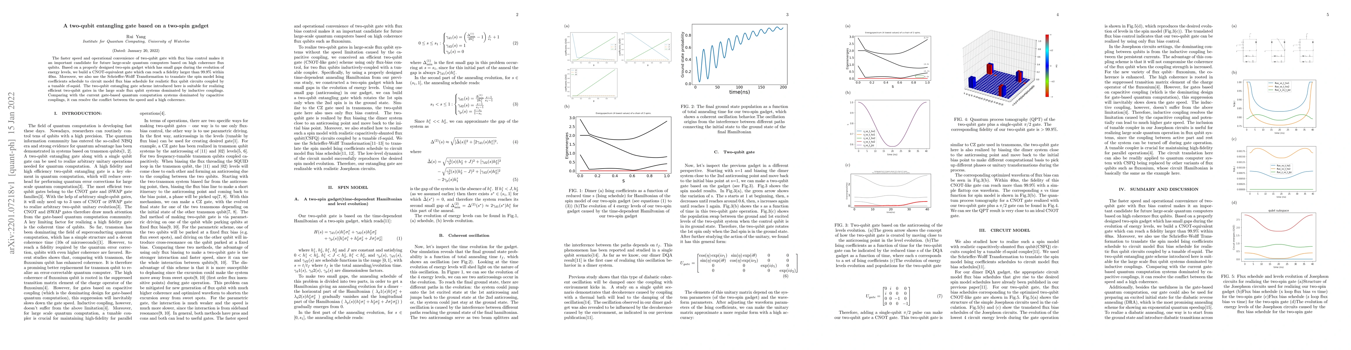 This paper proposes a two-qubit entangling gate based on a two-spin gadget, achieving a fidelity over 99.9% within 40ns using flux bias control. The method translates spin model coefficients to circuit model flux bias schedules, offering an efficient solution for large-scale flux qubit systems over capacitive coupling-based systems.