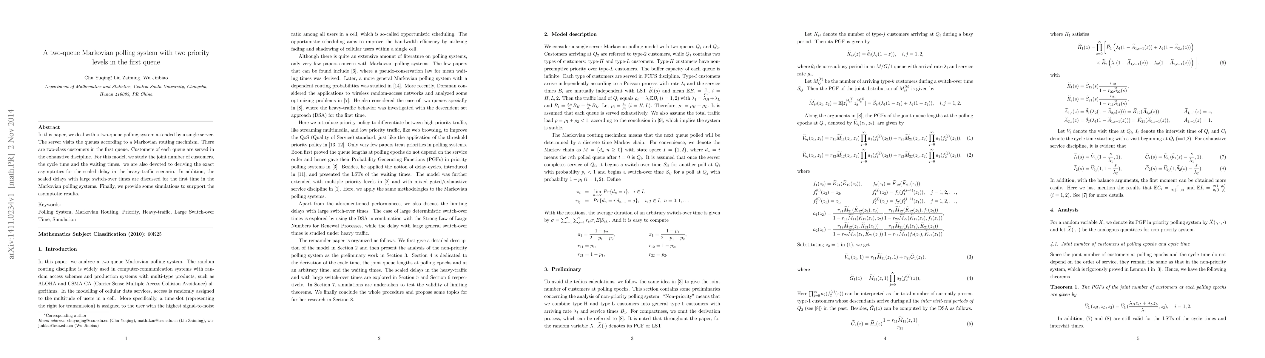 In this paper, we deal with a two-queue polling system attended by a single server. The server visits the queues according to a Markovian routing mechnism. There are two-class customers in the first queue. Customers of each queue are served in the exhaustive discipline. For this model, we study the joint number of customers, the cycle time and the waiting times. we are also devoted to deriving the exact asymptotics for the scaled delay in the heavy-traffic scenario. In addition, the scaled delays with large switch-over times are discussed for the first time in the Markovian polling systems. Finally, we provide some simulations to surpport the asymptotic results.