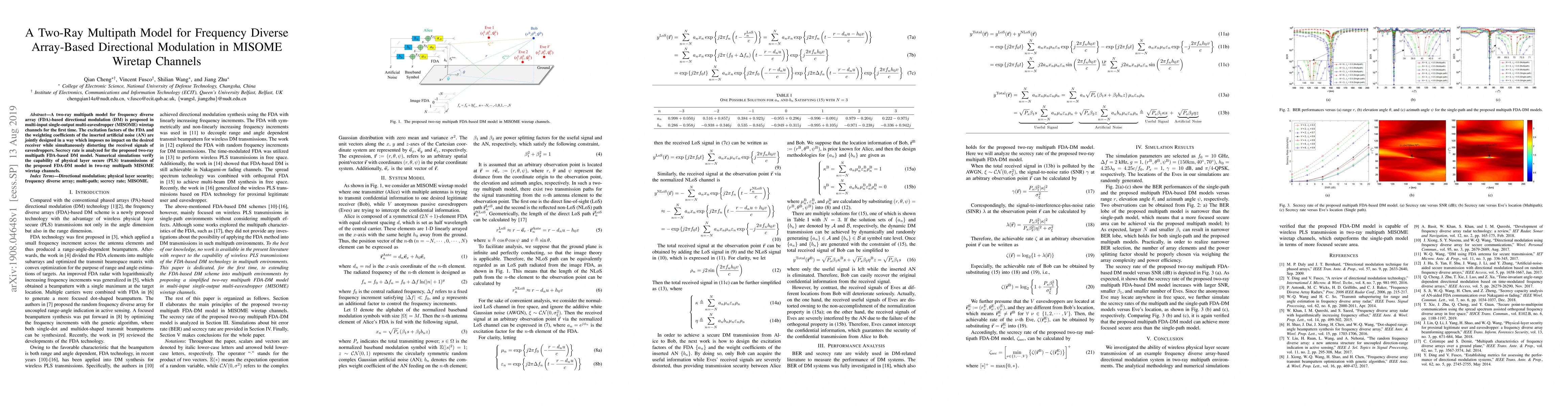 This paper proposes a two-ray multipath model for frequency diverse array-based directional modulation in MISOME wiretap channels, optimizing FDA excitation factors and artificial noise weighting to secure transmissions without affecting the legitimate receiver. Numerical simulations confirm the physical layer security of the proposed model.